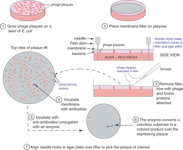 Specific DNA fragments are identified by annealing with a probe that has been labeled with radioactive phosphorus or fluorescent nucleotides. The probe is usually a piece of cloned DNA isolated from its vector. The probe is denatured into its two strands just before application to the membrane. This allows each strand of the probe to anneal to the denatured DNAs bound to the membrane. Radioactive nucleotides are incorporated into probes in several ways. Nick translation involves nicking one strand of the DNA double helix with DNase I and then elongating from this point by E. coli DNA polymerase I replacing one strand with radioactive nucleotides. In random priming, a mixture of many different oligonucleotides, usually hexamers, is annealed to denatured DNA strands to serve as a primer for elongation of the templates. This technique has the advantage of giving very high specific activities (usually greater than 109 cpm (counts per million) per μg with 32P-labeled nucleotides) and can be used to label DNA fragments in low melting point agarose directly after excision from an electrophoretic gel. Various alternative means to label probes, including production of a single-stranded probe with M13 phage or riboprobes (labeled RNA probes), are useful in special circumstances. When oligonucleotides are used as probes, they are simply end-labeled with polynucleotide kinase, which transfers the γ-phosphate (usually bearing radioactive 32P) from adenosine triphosphate (ATP) to a 5' hydroxyl group in DNA. The probe, if initially double stranded, is denatured thermally or by adjustment to an alkaline pH before hybridization. It is added to a suitable hybridization medium and allowed to anneal to the target DNA immobilized on the blot. Annealing or hybridization takes place best at approximately 5° C below the melting temperature (Tm) of the probe-target complex. The Tm can be influenced by the hybridization solution in several ways: it will increase in proportion to the logarithm of the ionic strength of the solution, and it will decrease in the presence of formamide or other denaturant. The Tm is influenced by the length of the probe and the percentage of bases that are G and C. G:C base pairing is more stable than A:T base pairing. A general formula for the melting temperature of a hybrid is: Tm = 81.5° C - 16.6(log10[Na+]) + 0.41(% G + C)– 0.63(% formamide) – (600 / probe length) where [Na+] is the sodium ion concentration in molar dimension, and probe length is in base pairs. In addition, the Tm of a hybrid is decreased by 1 × to 1.5 × for each percent of mismatch between the probe and its target sequence. Hybrids formed by RNA are slightly more stable, so an RNA-DNA hybrid might melt at a temperature as much as 10° C above the corresponding DNA-DNA hybrid. Finally, short oligonucleotides follow a different rule: Tm = 2(A + T) + 4(G + C) where each letter represents the number of that particular base in the oligonucleotide. For example, the Tm of a 20-mer with four A's, six G's, five C's, and five T's is 62° C. There are several protocols for hybridization in common use, each of which works well if used appropriately. These protocols have several ingredients in common. Ionic strength (Na+ concentration, other monovalent cations) and denaturants such as formamide influence the stability of specific hybrids. A second group of components including detergents (especially sodium dodecyl sulfate) and charged species (such as bovine serum albumin, polyvinyl pyrolidone, and ficoll in Denhardt's solution) tend to decrease nonspecific binding of the probe to the membrane, which is usually dependent on charge phenomena. Finally, components such as herring sperm DNA are designed to decrease nonspecific binding of repetitive elements in the probe to target DNA. Probes that contain repetitive elements also can be preannealed for several hours to a low Cot value with sheared human DNA so that these sites in the probe are “protected” and cannot recognize repetitive DNA on the membrane immobilized target DNA. This preannealing step blocks the repetitive elements in the probe so that only unique sequences of the probe are available to hybridize to DNA bound on the membrane. This decreases nonspecific binding when the probe is used for hybridization. Dextran can be included to increase the rate of hybridization. Usually the probe is incubated with a filter overnight to assure the specific hybridization of the probe to the filter-bound DNA reaches equilibrium. After hybridization of the probe to filter-bound DNAs, excess nonspecifically bound probe is rinsed off by a series of incubations in large volumes of buffer. Initially, nonstringent washes are performed. These buffers are usually approximately 300 mM salt and near room temperature. These preliminary washes remove most excess radioactive probe and are followed by stringent washes that are conducted at elevated temperatures, near the Tm of the probe. The buffer for a stringent wash contains about 15 mM salt, and the wash temperature is set at 52° to 68° C for 20 minutes. There are two to four changes of the stringent buffer. Under these conditions only tightly and specifically bound probe remains attached to the filter. Afterward, the membrane with the specifically bound probe is wrapped in Saran Wrap or sealed in a plastic pouch, placed in a light-tight cassette on a piece of x-ray film (autoradiography), and left to expose the film for 1 to 2 days. Usually two intensifying screens are placed in the cassette to shorten exposure time. To reduce reciprocity failure of the film, the exposure is normally carried out at -80° C. This low temperature reduces thermal decay of the first of the two interactions required for a latent image to form on the film. The image on the developed film identifies the hybridizing DNA bands. The comparison of cloned gene fragments with authentic human DNA can validate the cloning process and show whether the entire