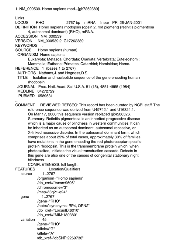NEIBank, A DATABASE OF EYE-SPECIFIC CDNAS AND GENES Illustrated in Figure 23 is a section of the webpage detailing abundant cDNAs found in un-normalized cDNA libraries from adult human retinas. The web page is from NEIBank, a catalog of information about the genes that are expressed in several different tissues from the eye. This collection is searchable in several different ways. In Figure 23, a list of cDNA clones expressed in the retina is shown. Only the first 19 clones of about 2700 are listed. The clones are listed by abundance of the cDNA in different retina-specific cDNA libraries. The most abundant cDNA is rhodopsin, and 138 clones were found in the database. The chromosomal location of each clone is listed. The GenBank entry and Unigene cluster entries also are given. GC stands for “Gene Cards” and a link is often provided to further information on the given gene. The NEIBank can be searched by gene, keywords, protein names, or general protein classifications. Each of the tissue-specific databases can be searched with a protein or DNA sequence using a “Blast” searching utility.