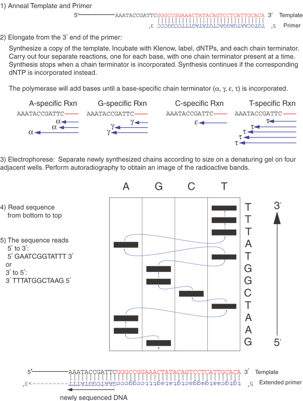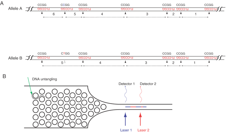 Separately, three other syntheses are carried out for each of the other deoxynucleotide and dideoxynucleotide pairs. This produces a full set of DNA fragments, all starting at the same point but ending at each base position of the DNA fragment being sequenced. Because of the small amounts of material being synthesized, a chemical label, or tag, is incorporated into the DNA during synthesis. For small-scale projects, the usual tag is radioactivity, which allows the DNA to be detected by autoradiography. The isotope most commonly used for DNA sequencing is 35S; it emits a β-particle that interacts with the emulsion of x-ray film placed on top of the sequencing gel, with the resulting image of the gel shown on the autoradiogram. For larger-scale sequencing projects (and increasingly even small projects), automated systems using fluorescent-labeled nucleotides now allow rapid and highly efficient sequencing of large amounts of DNA; hundreds of automated fluorescence-based sequencers were used to sequence the human and mouse genomes. The principle of chemical degradation sequence determination is partial degradation of DNA in four separate reactions, with each reaction specific for a different base. DNA is first labeled with a radioactive tag at one end and then subjected to the four degradation reactions. The reactions break the DNA at one specific base per strand. Because excess nonradioactive carrier DNA is included in the reactions, only partial degradation of the radioactive DNA occurs, ensuring that chain cleavage is random along the length of the DNA chain. The degraded chains form nested sets of molecules differing in length by only one base, and the products can be analyzed by acrylamide gel electrophoresis. Otherwise, the analysis of the products of the Sanger and the Gilbert method is very similar. Sequences larger than the typical 600-base reading are obtained by assembling overlapping sequence readings. The overlapping readings can be obtained by using a different primer, subcloning different DNA fragments, or using another trick, such as transposing a primer annealing site into other parts of the DNA insert. The redundancy inherent in overlapping sequence readings contributes to the accuracy of the completed sequence. To further heighten the quality and reliability of the sequence information, the sequence of each strand of the DNA is determined. Each strand complements the other; that is, an A on the first strand always forms a base pair with a T on the complementary strand, and C pairs with G on the other strand. Mistakes in interpreting gel readings or other ambiguities (sequence artifacts) from one strand usually do not occur at the corresponding position of the other strand. On occasion, the accurate determination of certain sequences remains troublesome, for example, regions very high in G + C content, but several methods have been devised to read these areas. These include the use of different polymerases, higher temperatures, and nucleotide analogs to aid in the sequencing elongation reaction. Also, higher temperatures during electrophoresis and inclusion of more potent denaturation agents in the acrylamide gels can help to prevent unusual structures in the DNA that may cause incorrect mobility in the gel or capillary. Last, a switch from the Sanger to the chemical degradation method may aid in determining the sequence. Sequences should be greater than 99.9% accurate. ALTERNATIVE SEQUENCING METHODS Other methods26 for DNA sequencing have been suggested, and three of these are worthy of discussion here. Common attributes of the three include (1) the analysis of single molecules of DNA, obviating the need to amplify or clone DNA prior to sequence analysis, and (2) no requirement for chemical degradation or synthesis to obtain a nested set of DNA molecules. In atomic force microscopy, one of these methods, because the four bases of DNA are shaped slightly differently, an atomic force microscope trace of a fragment of DNA theoretically can be used to decode the sequence.27 This technique currently resolves DNA of about 10 bp lengths,15 which is not sufficient for sequence analysis. Progress has been made to enable haplotyping of alleles.16 The second method employs a lipid bilayer containing a pore of hemolysin. DNA is driven through the pore by an electric field. Ideally, as each base passes through the pore there should be a slight fluctuation in current characteristic of the base that is passing at that instant. The sequence could be read by monitoring these small current changes with time.17 As yet, however, only short homopolymeric sequences can be differentiated. The third method relies on the hybridization of very short probes to a single long DNA molecule. The probes currently are tetramers labeled with a fluorescent tag. On average, any given tetramer will hybridize to DNA every 256 nucleotides, but due to the vagaries of any sequence, the interval between each complementary binding site of the tetramer varies, just as the pattern of restriction sites generates different-sized DNA fragments. Unlike restriction site analysis, however, the present system simultaneously determines not only the length of each interval between tetramer binding sites but also the order of these intervals. Figure 7 shows an example. With 256 different tetramers, every nucleotide in any sequence would be covered by hybridization. In principle, large genomes could be sequenced by this hybridization approach. This method begins with hybridization of tagged tetramers to isolated DNA, followed by determination of the positions of the hybridization signals. By passing a single DNA molecule lengthwise through a detector, the positions of the hybridized tags along the DNA are recorded. The steps of the technique are, first, to prepare genomic DNA or DNAs from BAC or YAC clones by conventional means. Second, labeled tetramers of the same sequence are hybridized to a long DNA fragment, resulting in