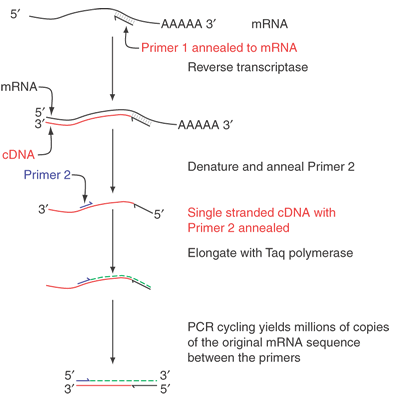 Despite these problems, microarrays exhibit numerous advantages that outweigh the known difficulties. It is an approach well-designed to exploit information encoded in the human genome sequence and is useful for basic and applied needs. PROTEOMICS AND CLONING A proteome is defined as the complete set of proteins produced from the information encoded as a genome. A proteomics-based strategy, based on a combination of mass spectrometry and database searching, has become popular for identifying a protein and obtaining its corresponding cDNA clone. Once the identity of the protein is established, because of the completeness of the human and other genome databases it is often possible to retrieve a cDNA or genomic clone from the original library source. The cDNA also can be obtained by PCR analysis (described later) The proteomics approach usually begins with finding a spot on a two-dimensional (2D) protein gel that is the unknown protein of interest or that contains a unique biologic activity. 2D gels separate proteins based on the isoelectric point (pI) and molecular weight. An alternative is to resolve a peak by multi-dimensional chromatographic analysis. Often the protein is considered interesting by virtue of being differentially expressed in a developmental or disease state. Once the protein is sufficiently pure and the correct protein spot is found, it is isolated and digested with trypsin. The resulting proteolytic fragments are subjected to analyses in mass spectrometers. The first such analysis is usually matrix-assisted laser desorption ionization time-of-flight (MALDI TOF) mass spectrometry (MS) This analysis provides experimentally determined masses of each tryptic peptide of the protein to within 0.01% accuracy. The set of masses of the numerous tryptic fragments are a characteristic “actual fingerprint” of the protein and, in principle, can be used to identify it. A database of known and predicted proteins has been derived from the human genome sequence. The masses of each set of tryptic peptides from each known or predicted polypeptide have been calculated from this protein database. The predicted set of masses from each protein in the database provides a “predicted fingerprint” to which the experimentally determined “actual fingerprint” is compared. We then ask whether the experimentally obtained actual fingerprint from the gel spot matches any of the thousands of predicted fingerprints in the database. Theoretically, one, and only one, protein should match perfectly, and this match provides us with the identity of the protein. It also provides us with the sequences of the protein, mRNA, and gene. There are some drawbacks and potential problems with this approach. First, a critical assumption is that the resolution of the 2D gel is sufficient to assure that only a single polypeptide is contained in the spot. While 2D gel technology can resolve about 2000 different proteins on a single gel, this may not be sufficient resolution if contaminating proteins have nearly the same mass and pI as the protein of interest. Second, the abundance of the protein under consideration may be very low, and it may be necessary to spend substantial time and effort to obtain an enriched protein preparation such that the single spot of interest has no contaminants in it. Third, it is unlikely that every tryptic peptide is extracted from the gel spot. Thus, not every theoretical peptide mass will have a match to a peptide in the experimental data set. Next, it is inevitable that proteins from skin and other sources will contaminate the experimental sample, creating extraneous peptide masses that can confound analyses. However, if we find many peptides matching within 0.01%, this agreement suggests that the unknown protein of interest has been identified. Scoring systems that assess the quality and extent of the matches help to judge the probability that the identified match is authentic, and web-based utilities such as Protein Prospector perform these calculations. If the z-score is above 1.65, then it is highly likely (odds > 95%) that the match is correct. Finally, much additional work is required to prove the putative identity. Sequencing the unknown protein by Edman degradation or a sequencing based on b- and y-daughter ion series from MS–MS experiments22 is, at a minimum, a firm requirement to establish and validate identity of the protein. Sometimes proteins are post-translationally modified. Under these circumstances the identification of the modifications may be made by additional MS methods22. Once the protein is identified, in many cases, a cDNA or genomic clone corresponding to the newly identified protein can be obtained merely by ordering the clone from one of several commercial repositories.* A caveat is that these clones may not be complete. However, within days or even hours of identifying the protein of interest, it is possible to obtain at least a partial cDNA or genomic clone. *Some sources are Research Genetics, Inc., Birmingham, AL; Open Biosystems, Huntsville, AL (which has the National Eye Institute [NEI] sequenced clone collection); and Incyte Genetics, St. Louis, MO. BIOINFORMATICS AND DNA SEQUENCE ANALYSIS To acquire the information that a gene contains, we need to determine the sequence of bases in it. The entire human genome has now been sequenced, providing a database of all the approximately 35,000 genes in the human body, a molecular anatomy of the human genome. The sequences of this genetic material are now held in several commercial and public databases. While there are still some gaps and little of the normal variability of the genome has been assessed, the availability of this sequence has changed the way in which positional cloning is carried out. The genomes of several additional organisms are also near completion. These provide a vast warehouse of useful information that ultimately will be employed in (1) elucidating the specific functions of all 