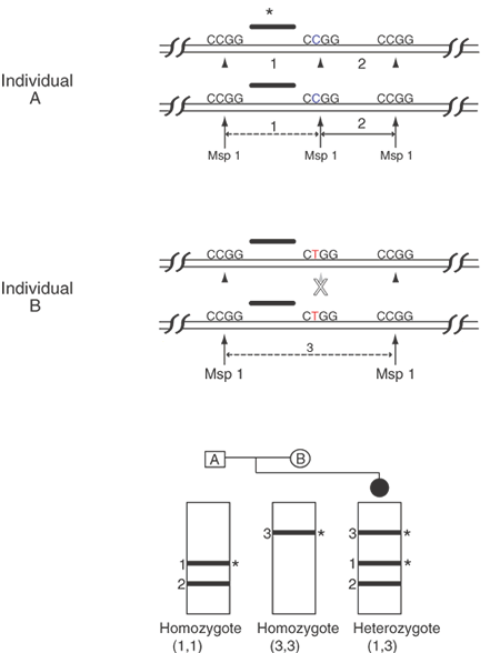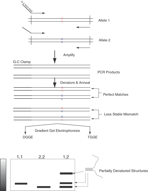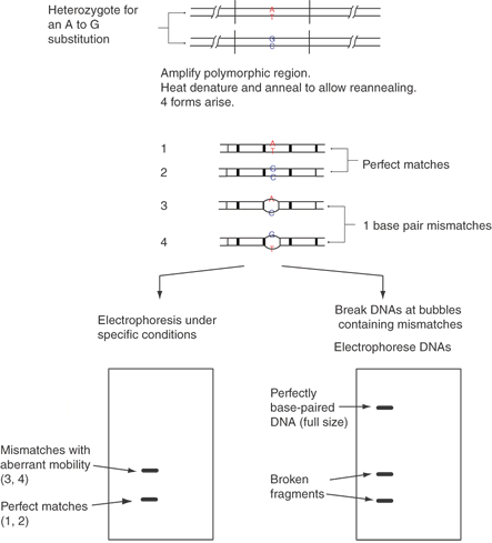 Single-base sequence variations can be analyzed by PCR assay. Suitable oligonucleotides flanking a base change are used to prime the PCR, amplifying the included region by as much as a millionfold. Within limits of approximately 100 bp to several kb, the size of the amplified fragment can be adjusted for convenience in the analysis, especially if multiple loci are to be analyzed simultaneously. Once the target sequence is amplified, it can be analyzed in several ways. Most directly, the PCR sample can be digested with an appropriate restriction enzyme for the base change, subjected to gel electrophoresis, and visualized by staining with ethidium bromide or other dye that fluoresces only when bound to double-stranded DNA. This provides an efficient and reliable analysis without requiring radioactive label. This technique is shown in Figure 10. Another approach is to employ one primer that contains a perfect match to one allele but that bears a single base mismatch at the 3' end with the other allele. This primer provides a specific amplification only when the perfectly matched allele is present. By analyzing PCR product accumulation after each cycle, typing of an individual can be carried out. The patient's status as a double homozygote for one allele, a homozygote for the other allele, or a heterozygote can be accomplished (Fig. 11). One limitation of the PCR technique is that the polymerase used sometimes misincorporates the wrong nucleotide. Thus, care must be taken when single PCR products are subcloned and analyzed by DNA sequencing or restriction analyses. At least three clones must be analyzed to ensure that the correct sequence has been obtained. When the entire PCR product is analyzed directly, this low frequency of errors is of little import. Several different polymerases are now available, including Pfu, Vent, and Hot Tub polymerases, which have lower error rates than Taq polymerase. POINT MUTATION DETECTION Point mutations are variations at one base. These can be detected if they fall in restriction enzyme recognition sites as described in the section on RFLPs or by several other techniques, also described in this section. Each of these techniques has advantages and has played a role in developing polymorphic markers in the past decade. Orita and associates32 developed an approach for detection and identification of single-base changes called single-stranded conformation polymorphisms (SSCPs). Amplified DNAs are denatured by boiling and allowed to renature in dilute conditions that favor intramolecular interactions rather than allowing double-stranded complexes to form. Sequences that are identical except for a single-base variation may form similar, but not identical, secondary structures. Frequently, the free energy of the most stable structures may be very close, but the secondary structures may look entirely different. Inclusion of 10% glycerol, different detergents, or variation of the temperature at which a gel is run can markedly enhance the differences in mobility of two related DNA species. Although renaturation conditions must be optimized to maximize the differences in mobilities of two nearly identical sequences, once found, the technique is rapid and simple. Heteroduplex analysis can be carried out directly after PCR amplification by the addition of one extra cycle of heat denaturation and slow cooling. In an individual who is a heterozygote for a point change, three types of annealed DNA duplexes will form. One pair of DNA strands will be homogeneous for allele 1 sequences (a homoduplex), another homoduplex pair will be homogeneous for allele 2, and the third pair will be a heteroduplex of one strand from allele 1 and the other strand from allele 2, as shown in Figure 12. The homogeneous strands of both alleles usually run with identical mobility on a polyacrylamide gel; however, the heteroduplex usually runs slightly slower. This decrease in mobility is due to the lack of the hydrogen bonding of bases at the point variation, creating a “bubble” in the middle of the double stranded DNA. Again, the conditions of electrophoresis can be optimized to maximize the mobility difference of the homogeneous DNAs compared to the heteroduplex structures.33,34 Newton and co-workers35 applied chemical degradation reactions to modify selectively the nonpaired bases of the heteroduplexes and then break the DNA strands at the modified bases.36 The heteroduplexes are cut into two or more smaller fragments of DNA, distinguishing heterozygotes from the homozygotes, as shown in Figure 13. A similar technique consists of hybridizing RNA complementary to one allele with sample DNA.37 The RNA-DNA hybrid is then treated with RNase A. If even a single base mismatch exists, the RNA will be cut, and the sample can be analyzed by gel electrophoresis. This is similar in principle to the analysis of DNA-DNA hybrids by modified Maxam-Gilbert sequencing reactions, in which strand breaks occur preferentially at mismatched bases.36 Techniques dependent on melting hybrids or snapback regions of a DNA strand, such as denaturing gradient gel electrophoresis, have been useful.38 Denaturing gradient gel electrophoresis (DGGE) and thermal gradient gel electrophoresis (TGGE) are similar techniques designed to identify the differences of the heteroduplexes and the homoduplexes. Denaturing gradient gel electrophoresis allows reliable identification of single-base changes in a DNA fragment up to 1 kb in size. These techniques are illustrated in Figure 13. DGGE and TGGE are based on the principle that the heteroduplex, because of its one mispaired set of bases, is less stable than a homoduplex. By performing electrophoresis of these DNAs in an increasing gradient of either temperature (TGGE) or concentration of denaturant (DGGE), the heteroduplex will partially melt before the homoduplexes. Together with the property that Y-shaped and partially denatured DNAs are much less mobile than double-stranded DNA