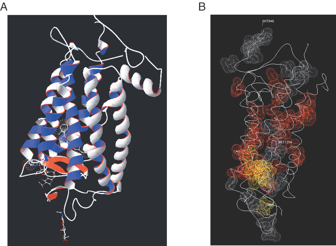One ADRP mutant human opsin gene bearing the P23H change has been introduced into transgenic mice, and it yields mice that have retinal degeneration.95 Other biologic evidence comes from Sung and co-workers, Kaushal and Khorana, and DeGrip and colleagues.96–98 They introduced a series of putative opsin mutant cDNAs into cultured human cells, isolated the expressed opsins, and tested them for the ability to bind 11-cis-retinal and to be bleached by light. They also monitored the processing and integration into the rough endoplasmic reticulum and plasma membranes of each of the different opsins. They found that among the mutants, there were three classes of phenotypic changes. In Class I, mutants resemble wild-type rhodopsin in several characteristics, including amount of opsin accumulated in the plasma membrane, difference spectra, amount of the regenerated rhodopsin, and intracellular distribution. Three mutants, F45L, Q344ter, and P347L,99 had these characteristics. These mutants inefficiently activate transducin that ultimately results in damage to the rod cell. A second class (Class II) contained mutants that accumulated in the plasma membrane at low levels, regenerated poorly with 11-cis-retinal, and remained primarily in the rough endoplasmic reticulum (rER). Most mutants fall into this class (see Table 3). Class III mutants were noted by Kaushal and Khorana.97 These mutants are expressed only at very low levels and are instable. DeGrip and associates98 described mutants that may fall in this third class. The quaternary structure of rhodopsin has been analyzed by atomic force microscopy.100 In the outer segment disc, rhodopsin molecules appear in pairs that polymerize into cords of 6 to 12 dimers. Five or six cords are grouped together into 2D paracrystalline arrays of 50 to 100 rhodopsin molecules in the lipid bilayer. The overall density of rhodopsin molecules is about 50,000 per μm2 on the surface of one side of a disc membrane, and it appears that about 80% of the disc surface is rhodopsin. Also, the tertiary structure of rhodopsin has been obtained from crystals of bovine rhodopsin and x-ray diffraction analysis.101,102 The 3D structure is depicted in Figure 18A. The positions of ADRP and congenital stationary night blindness (CSNB) mutants have been mapped onto 3D (Fig. 18B) and 2D (see Fig. 17) representations of the rhodopsin structure. A helical wheel map103 has been constructed and can be found online§; this map shows the positions of opsin missense mutants and their interacting amino acids. Some loose correlations between structure and causative mutations are beginning to emerge. There is no obvious pattern detected between position on the primary sequence and mutations (that is, there are no mutation hot spots or clusters in the linear representation of the primary sequence). However, many ADRP mutations are located in the transmembrane helices,103 and although it is obvious that the bulk of the protein resides in these helices, many of the mutants are in residues that make interhelix connections by van der Waal's interactions.103 Filipek and colleagues103 inferred a contact between residues from two different helices if the distance between them is less than 4.0 Å, slightly larger than the sum of the van der Waals radii. Some mutations do not make contact with other residues within the same molecule of rhodopsin. These may be involved with the binding of lipids or inter-protein contacts. § http://physiol.annualreviews.org/cgi/content/full/65/1/851/DC1#fig6b.