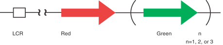 Color Vision Anomalies Several important studies of the color visual system have been undertaken. Nathans and co-workers124–126 were the first to clone rhodopsin and the color pigment genes. They also were first to study mutations of the color genes. The opsin gene is on chromosome 3q, the blue cone gene is on chromosome 6, and the red and green genes are on the X chromosome. The red and green genes are very similar in sequence and are located only approximately 10 kb apart. They are arranged head to tail in the same transcriptional orientation. The green gene can be found in single, duplicated, or triplicated forms in the human population as the result of unequal crossing over (Fig. 19). One interesting ophthalmologic disease that has been explained at a molecular level is blue cone monochromacy (BCM), a form of achromatopsia. This is an X-linked form of color blindness in which cones respond only to blue light. BCM was mapped to Xq28, the chromosomal region also known to contain the red and green color pigments.127 When these genes were examined in BCM patients,128 an interesting observation was made. The highly similar red and green pigment genes normally occur as a head-to-tail tandem array with a red pigment gene followed by one or more green pigment genes. Most instances of BCM result from unequal homologous recombination events occurring in this array, resulting in the deletion of all but a single remaining gene (occasionally a red-green hybrid gene), or leaving two genes, one of which was then inactivated by a point mutation. Additionally, deletions in a region approximately 4 kb upstream from the red pigment gene can result in inactivation of both genes, suggesting that the lost regions contain cis-elements (DNA sequences near the gene that they control) coordinately controlling the expression of either gene in an individual cone. The elegant delineation of this pathophysiology is a classic example of the powerful analysis available produced by combining molecular genetics with clinical acumen. In one case, fundoscopic examination revealed a progressive and bilateral central degeneration. Parallel studies of the blue pigment gene show a lesion caused by a substitution of serine for a well-conserved proline at position 264.129 This causes an autosomal dominant tritanopia. Also, Weitz and co-workers130 showed that the substitutions G79R and S214P lead to autosomal dominant tritanopia. The alteration of the blue pigment resulting in tritanopia and the elucidation of BCM lend support to the trichromatic theory of color vision. The value of testing patients for color blindness is in the counseling that the patient or his or her parents receive.131 For example, the patient might be advised against career choices that require accurate color vision. In understanding the color visual process, it is important to define the hereditary nature and the underlying molecular defect in these diseases. There are other forms of achromatopsia that are not defective in any visual pigments, and the functions associated with these gene defects may require higher-order neural processing in the brain. Retinoblastoma Retinoblastoma is a rare ocular tumor observed primarily in young children. Arguably some of the finest advancements and achievements in molecular biology of cancer have come from the studies of the cause of retinoblastoma. It is beyond the scope of this chapter to review these studies, but some key references are given to aid in further reading. Although retinoblastoma seems to be inherited as an autosomal dominant trait, the retinoblastoma susceptibility (Rb1) gene is a tumor suppressor gene of which mutations are recessive at the molecular level. The Rb1 gene has been cloned and sequenced.132 Knudson133 hypothesized that both copies of the oncogene must be inactivated for a tumor to form so that it takes two genetic events to cause retinoblastoma. The Rb1 gene was localized to 13q14 by examination of chromosomal deletions, and a minimum region of common overlap was identified.134,135 Dryja and colleagues132 discovered a putative gene candidate, and Friend and associates136 found a candidate cDNA. This was shown to be the correct gene and cDNA by several criteria. The gene product (pRB) of the Rb1 gene apparently functions by interaction with several DNA-binding proteins.137 The primary function of pRB is to regulate transcription factors in a cell cycle– and cell type–specific manner. Positive regulation by pRB occurs through interactions with transcription factors involved in terminal differentiation. An important example of negative regulation by pRB is the binding of pRB to E2F, blocking E2F from activating transcription and preventing entry into S phase of the cell cycle. pRB is a phosphoprotein, and its activity is controlled by phosphorylation. It is hypophosphorylated pRB that represses transcription of genes required for S phase. Site-specific phosphorylation of pRB is mediated by cyclin-dependent kinases (CDKs) and regulates the binding of pRB to many proteins. Dephosphorylation of pRB is due to the activity of phosphoprotein phosphatase type 1 (PP1).138–141 In addition to direct interaction with trans- factors, pRB recruits chromatin-remodeling proteins and co-repressors to help silence promoters. Formation of complexes between pRB and HDAC or BRG1 was shown to regulate some but not all E2F-regulated genes.142 Diagnosis of retinoblastoma can now be made at the genetic level by PCR testing. Timely PCR diagnosis of Rb1 provides earlier treatment and better outcomes and saves lives. Optimized Rb1 mutation detection reduces the number of children (from at-risk families) undergoing repetitive clinical examinations. This saves money and reduces stress on the children. These savings well exceed the cost of PCR testing.143 LESSONS FROM THE GENETICS OF THEDROSOPHILA VISUAL SYSTEM Fruit flies are one of the classic systems in which to study eye mutations. Many of the original muta