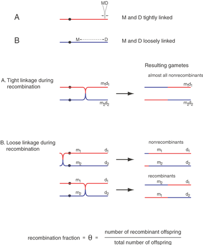 markers or polymorphisms, discussed previously. Two genetic loci are said to be linked if they tend to be inherited together within families. This co-inheritance corresponds to physical proximity on the same chromosome. If chromosomes were always inherited as intact units, the alleles of loci located on the same chromosome would always be co-inherited. However, homologous chromosomes exchange pieces during meiosis, a process called crossing over. Crossing over occurs during the pachytene stage of meiosis I, when the chromatids of homologous chromosomes are joined by the synaptonemal complex and exchange segments, or recombine. This crossing over is evident microscopically in diplonema, the next phase of meiosis I, as the tetrads separate and chiasmata (literally, cross pieces) become visible. Usually, about one chiasma is visible for each chromosome. For the human species, this process performs the useful function of increasing genetic diversity. For the geneticist, crossing over can result in the failure of alleles at two linked loci to be co-inherited. Thus, the closer two loci are on the chromosome, the less likely a chiasma is to form between them and the more likely that they will be co-inherited. Alternatively, if two (or any even number of) cross-over events occur between two loci, they will end up again on the same chromatid and will appear not to have recombined at all. Genetic linkage between a disease and the marker does not imply that the disease occurs with a specific allele at the marker locus in the general population. The latter phenomenon, termed association, is a statistical association between a specific allele at a genetic locus and a given disease more often than would be expected by random chance in human populations. Association is often found for the HLA locus and usually involves multifactorial diseases with a relatively small genetic component. Conversely, association does not imply genetic linkage, although one possible mechanism for association is close genetic linkage with linkage disequilibrium (see later). The recombination fraction (θ) between two markers is the fraction of offspring in which a detectable cross-over event occurs between the loci. When two markers are close together, more than one cross-over event is unlikely to occur between them, and the recombination fraction is approximately equal to the genetic distance, x, so that x ≈ θ. The genetic distance is measured in units called “Morgans” (M), honoring T. H. Morgan, a pioneering Drosophila geneticist. One hundredth of a Morgan is a centiMorgan (cM), and over small genetic distances 1% recombination roughly equals 1 cM. Over greater distances double recombinants occur and decrease the apparent recombination frequency compared with the genetic distance. The genetic distance can be calculated from the recombination frequency using various formulas, depending on the assumptions made about the frequency of double recombinations over a given genetic distance. The formula derived by Haldane: x = -1/2 ln(1 - 2 θ) with the inverse mapping function θ = 1/2 (1- e- 2x) assumes that an initial cross-over does not affect the probability of a second cross-over event within that region, described as no interference. In reality there might be some decrease in frequency of second cross-overs in a region after an initial cross-over has occurred, termed (positive) interference. Formulas have been derived by Kosambi and others that approximate this in a variety of ways, depending on the particular assumptions made about the strength of interference.152 These formulas have important features in common. First, they are all based on the recombination fraction in some fashion, and so they estimate genetic distance. Second, unlike recombination fractions, genetic distances are additive, so the distance between two markers should equal the sum of the distances between all markers between them. Finally, the idea of map distance formalizes the linear arrangement of genes into a genetic map, an extremely useful concept when combined with modern recombinant DNA technology. The linkage relationship between two markers (or a disease and a marker) will influence the probable inheritance pattern of these markers in a given family. For example, as mentioned previously, two markers are likely to be co-inherited if they are closely linked. Thus, finding that two markers are co-inherited in a large family would make one think that they might be closely linked, whereas finding that their alleles assort randomly would make one suspect that they are not linked. If two markers are linked at an intermediate recombination fraction (between 5 and 20 cM), the two markers will be co-inherited often but will recombine with a frequency roughly equal to the genetic distance in cM. Although human pedigrees often are too complicated to allow a direct calculation of the recombination frequency by counting recombinant and nonrecombinant meioses, the linkage relationship between two markers can be calculated using a type of analysis called maximum likelihood estimation. One can estimate the likelihood of a particular inheritance pattern for a set of markers assuming a given linkage relationship (or recombination fraction) between these markers. This likelihood can then be compared to the likelihood of that particular inheritance pattern appearing if the markers were not linked. The ratio of these two likelihoods (i.e., of linkage at a given recombination fraction versus nonlinkage) is called the odds ratio for linkage at that recombination fraction: The odds of linkage at a given θ = likelihood (given pedigree assuming θ) ÷ likelihood (given pedigree assuming unlinked, θ = 0.5). This ratio is usually expressed as a logarithm. The value is called the logarithm of the odds or lod (rhymes with odd) score: lod = log10[L(pedigree given θ) ÷ L(pedigree assuming unlinked)] Thus, a lod score of 1 represents 101:1 or 10:1 odds that a marker i