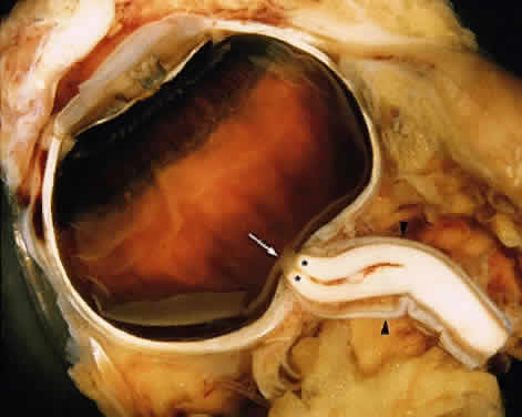 Microglia usually reside quietly in the optic nerve, but they can be easily activated by trauma, inflammation, edema, or degenerative conditions. The activated microglia become oval or rod-shaped, their small nuclei enlarge and become elongated, and the complicated cytoplasmic processes are withdrawn. Activated cells can phagocytize a variety of materials and can express major histocompatibility complex class I and II molecules (see Fig. 5).22,23 Optic Nerve Sheaths and Their Spaces The intraorbital portion of the optic nerve is enclosed by three sheaths that are continuous with the meninges of the CNS: the dura mater, arachnoid, and pia mater (Fig. 6). The outermost of these is the dura mater, a dense collagenous and elastic tissue. Anteriorly, the dura mater frays and inserts into the sclera and rectus muscle sheaths along with the ciliary arteries and nerves. Posteriorly, the dura mater divides into two layers. One of these layers fuses with the periosteum of the bony canal and with Zinn's annulus at the apex of the orbit; the remaining layer is tightly adherent to the bone of the canal and the optic nerve. When the optic nerve passes the cranial foramen of the canal, the dura mater becomes the periosteum of the sphenoid bone. Therefore, even small lesions that occur within the canal or at its openings will compress and damage the optic nerve. The arachnoid is composed of trabeculae of collagenous and elastic fibers lined by meningothelia. It contains numerous vessels, along with some fibroblasts and histiocytes. The meningothelia often proliferate in a concentric pattern and form onion-like structures, with or without calcification, known as the psammoma bodies or corpora arenacea, respectively. The pia mater lies tightly on the surface of the nerve and consists of collagenous fibers, elastic fibers, and a fused glial layer. The pia mater invests the nerve and sends fibers into it to form the characteristic septa. The septa are separated from the surrounding nervous tissue by the foot processes of the astrocytes, but they are continuous with the collagenous adventitial sheaths of the central retinal artery and vein within the optic nerve. The pia mater joins the sclera and choroid anteriorly; posteriorly, it continues through the optic foramen to form the single sheath around the intracranial portion of the optic nerve. The potential space between the dura mater and the arachnoid, known as the subdural space, does not communicate with the corresponding intracranial space and has little clinical significance. The subarachnoid space, between the arachnoid and the pia mater, is continuous with the corresponding intracranial space. It transmits cerebrospinal fluid, which provides a pathway for the spread of blood, infectious agents, and tumor cells between the eye and the CNS. |