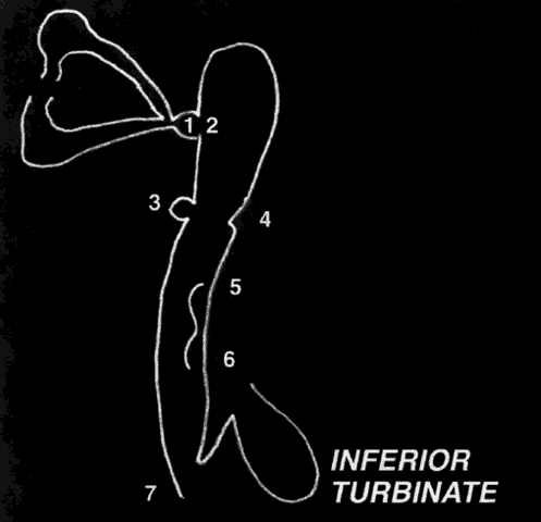 The rounded anterior lacrimal crest is poorly defined above (see Fig. 26), but becomes well defined inferiorly as it continues with the infraorbital margin (Fig. 28). The medial canthal tendon attaches superiorly on the anterior lacrimal crest, where a small tubercle is sometimes found. Inferiorly, the orbital septum and some superficial orbicularis oculi fibers attach to the anterior lacrimal crest. The anterior lacrimal crest is stronger than the posterior lacrimal crest. The posterior lacrimal crest is more sharply defined than the anterior lacrimal crest (see Fig. 26) and may present as a prolonged plate of bone curving forward over the fossa. Superiorly, it is continuous with the medial orbital rim. The posterior lacrimal crest is the strongest component of the lacrimal bone. The posterior lacrimal crest is stronger and flatter superiorly, where the deep head of the pretarsal orbicularis oculi muscle inserts. The orbital septum also inserts onto the posterior lacrimal crest and continues inferiorly to cover the pars lacrimal muscle of Horner on its posterior surface. Just anterior to the posterior lacrimal crest, the bone becomes quite thin and is aerated by ethmoidal air cells. Just behind the posterior lacrimal crest, the lacrimal bone may again thin and extend posteriorly, or it may immediately meet the ethmoid bone. The middle turbinate is an outcropping of the ethmoid bone and may project anteriorly into the nasal cavity to lie medial to the lacrimal fossa19,28 (see Fig. 22). Clinically, on occasion, the anterior portion of the middle turbinate must be excised during dacryocystorhinostomy to establish an unobstructed osteotomy. The Nasolacrimal Canal The nasolacrimal canal is a short, bony tube extending inferiorly, laterally, and posteriorly from the lacrimal fossa toward the inferior meatus of the nose. It contains the membranous nasolacrimal duct. The maxillary bone forms the anterior, lateral, and posterior walls of the canal. The medial wall of the nasolacrimal canal is formed superiorly by the descending process of the lacrimal bone, which articulates with the ascending processing of the inferior turbinate bone below. In some cases, the medial wall of the nasolacrimal canal is almost entirely formed by the maxilla (Fig. 29), with a corresponding decrease in contribution from the lacrimal and inferior turbinate bones. This results in a narrowing of the nasolacrimal canal and corresponding nasolacrimal duct.29