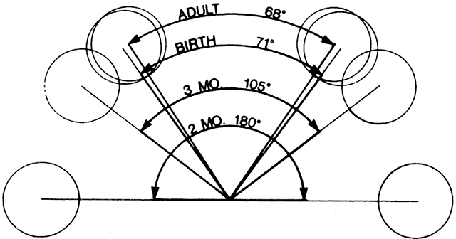 in being progeny of the neural crest anlage. Conversely, endothelial cells forming the inner lining of orbital vessels are believed to be an ingrowth into the orbital region of true mesoderm; whether the striated extraocular muscle cells are ingrowths from the preotic somites4 or whether they represent in situ differentiations of true mesectodermal rather than mesodermal cells is debatable. The latter possibility is more plausible if one remembers that neural tumors are well known to be able to produce heterologous striated muscle differentiations (e.g., in intraocular medulloepitheliomas and in peripheral nerve sheath malignancies [so-called triton tumors]).5–9 Further, certain smooth muscle tumors of the ciliary body and orbit may show unusual neural characteristics in their growth patterns; these have been referred to as mesectodermal tumors.10–12 Extremely unusual dysontogenetic tumor masses may occur around the orbit and can combine connective tissue and neural elements (ectomesenchymomas).13 The scaffolding of the orbital bones is laid down within the first 2 months of embryogenesis.4 Migration of the neural crest cells proceeds over the face along two routes, which meet in the area of the orbit.14 The maxillary wave of neural crest cells curves around the developing eye from below, while a frontonasal anlage migrates over the procencephalon and approaches the optic stalk from above (Fig. 2). Thus, the floor and lateral wall of the orbit are contributed by the maxillary process, whereas the lacrimal and ethmoidal bones are contributed by the frontonasal process. The significance of this migratory pattern cannot be overemphasized and is paramount for understanding the location of congenital orbital, eyelid, and lacrimal anomalies (Fig. 3). A failure of fusion between the neural crest waves results in clefting syndromes, at least 30 of which involve the orbit.15 Also, the typical location of dermoid cysts at the frontozygomatic and frontoethmoidal suture lines is the result of a sequestration of surface ectoderm in areas of neural crest cell fusion. Finally, it appears that the superficial spread and deep invasion of basal cell carcinoma on the midface may be at least partially due to the location of the embryonic fusion planes.16 The lesser wing of the sphenoid bone is initially cartilaginous, but the greater wing and the rest of the orbital bones are membranous in nature and ossify and fuse between the 6th and 7th months of gestation. As the orbital bones develop, the eyes converge from an initial 180° relation to their final position of 68°, achieved in infancy. However, the orbital axis remains somewhat divergent at birth (115° between the lateral orbital wall and the skull axis) when compared with that of adults (45°) (Fig. 4).15 The ethmoidal sinuses can be observed to begin to take shape between the 6th and 8th weeks of gestation and are fully developed at birth. The remaining paranasal sinuses develop much later, with the sphenoid and frontal sinuses continuing to pneumatize into adolescence or early adulthood (Fig. 5). This accounts for the high incidence of orbital cellulitis from adjacent ethmoiditis in children. The lamina papyracea separating the orbit from the ethmoidal air cells is thin and perforate in children, providing easy access for microbial spread. Because the remainder of the sinuses are rudimentary in children, they are rarely the source of orbital infectious processes. Most of the orbital bones are formed during the 3rd month, although their ossification ensues over the next several months. At term, the orbit is nearly hemispheric, and the bony perimeters closely hug the globe.17 The eye reaches adult size by about age 3 years, but the adult dimensions of the orbit (a volume of 30 ml, a lid skin to orbital apex depth of 5 cm, and an overall quadrangular pear shape sweeping toward the medially situated apex) sometimes may not be attained until as late as age 16 years. As the midface develops in puberty, the vertical dimensions of the orbit increase, achieving an adult configuration. The orbit will fail to reach its normal volume if the globe is micro-ophthalmic or if radiotherapy in large doses (as for retinoblastoma or rhabdomyosarcoma) is administered. Conformers of increasingly greater diameter and soft tissue expanders can be inserted into the conjunctival cul-de-sacs of pediatric patients with anophthalmic orbits to promote orbital enlargement.18–20 The extraocular muscles (EOMs, ultimately destined to be four rectus muscles and two oblique muscles) appear as three separate masses of mesenchyme at about 4 weeks' gestation. The oculomotor and abducens nerves grow into the muscle masses at about 31 to 33 days' gestation. The ciliary ganglion is identifiable at about 6 to 7 weeks' gestation. At 5 weeks' gestation, the muscle cone is apparent around the optic nerve, and thereafter the muscle mass grows posteriorly to insert onto the cartilaginous skeleton of the sphenoid bone. The shared apical tendinous origins of the rectus muscles ultimately become the annulus of Zinn surrounding the optic foramen and superior orbital fissure. Anteriorly, the muscles fuse at the end of the 3rd month through tendinous differentiations with the sclera in the vicinity of the equator of the globe. Condensation of periocular tissue, analogous to Tenon's fascia bulbi, is identifiable at 10 weeks' gestation. Myofibrils are identifiable in the anterior portions of the muscle masses during the 6th week of gestation. Sevel21 has demonstrated that EOM differentiation goes through the phases of indifferent mesenchymal cell, early myoblast cell, fused myoblast cells, myotube cells, and finally mature muscle cells. A fibrous trochlea, which later becomes cartilaginous, is initially seen just behind the superonasal orbital rim at the 37- to 40-mm stage of gestation; through it will run the tendon of the superior oblique muscle. The trochlea may rarely become idiopathically inf