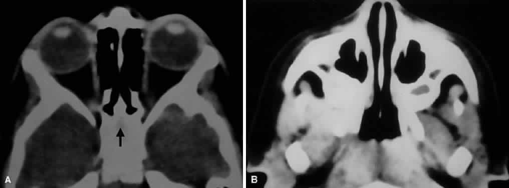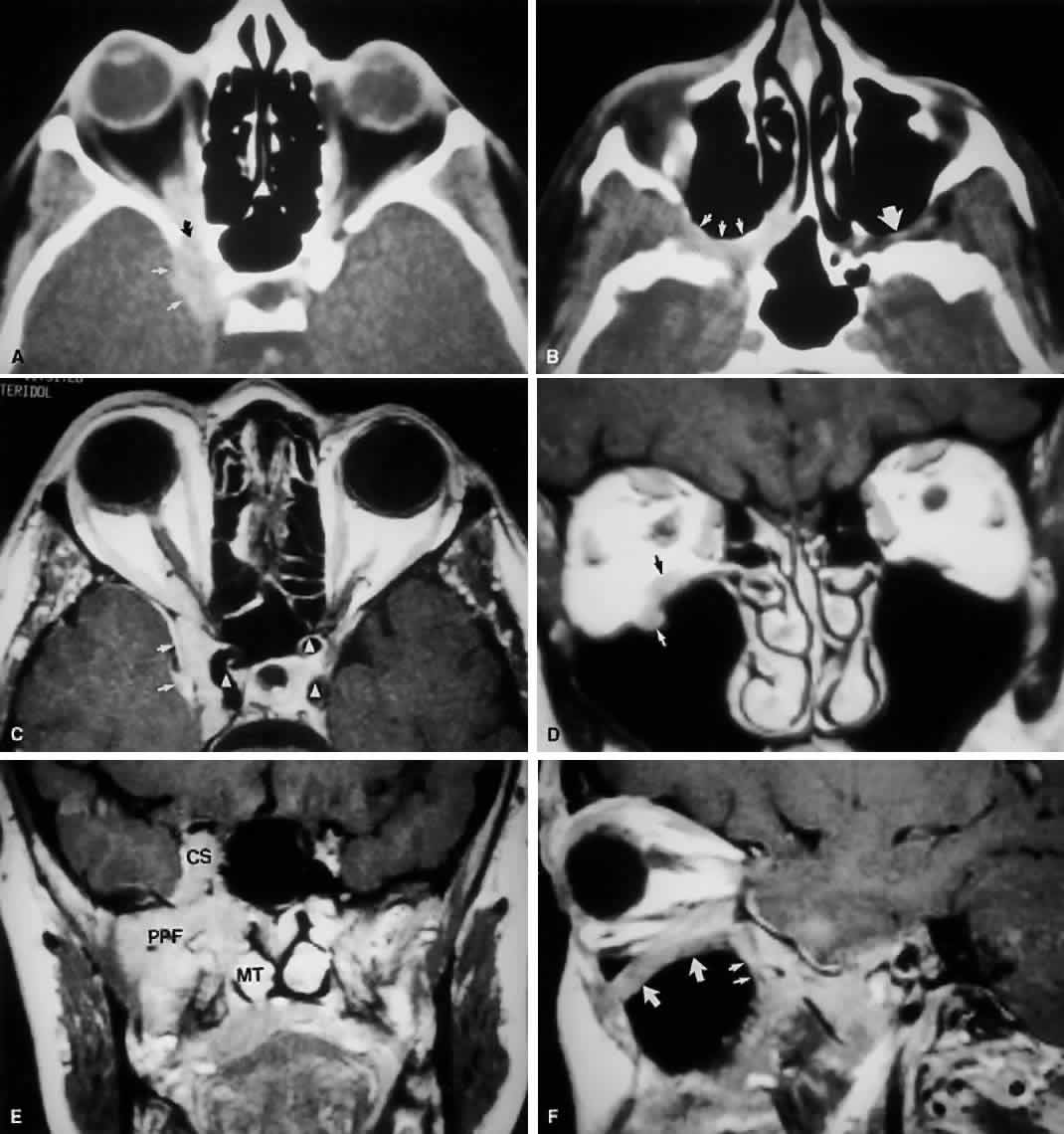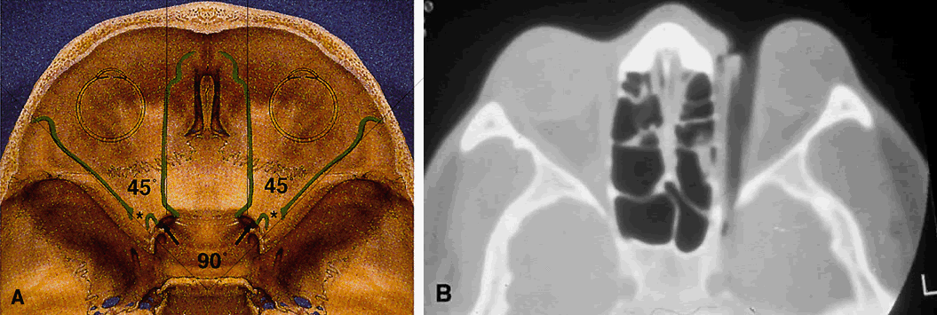 A clear understanding of the relation of the bony orbit to the skull and the midface allows for a logical interpretation of the clinical and radiographic patterns of orbital disease. The bones of the face may be considered to hang from the skull, with attachments at the frontozygomatic and frontoethmoidal sutures, as well as the sphenoid bone. Craniofacial dysjunction occurs in these areas in Le Forte III fractures, and the sites of craniofacial articulation are also the basis for the Le Forte III osteotomies used for facial reconstruction in patients with craniofacial synostoses. The complex shape of the sphenoid wing provides for an intimate communication between the CS, the orbital apex, and the pterygopalatine fossa. Radiographically, the spaces and foramina of the orbital apex may be considered to lie in three tiers (Fig. 8). The CS is found on the same level as the orbital apex, connecting directly with it via the superior orbital fissure (SOF) to form the middle tier. The inferior tier is formed by the inferior orbital fissure (IOF), which provides direct communication between the orbital apex and the pterygopalatine fossa, a vertically oriented space directly behind the maxillary sinus. Finally, the optic canal has no direct communication with any of the aforementioned spaces and should be considered to lie above the SOF and CS, exiting the orbit in a superomedial course through the body of the sphenoid as the superior tier.26 Orbital apical lesions can therefore gain ready access to the CS and pterygopalatine fossa (Fig. 9). Spread into the cranial vault through the optic canal is usually limited to lesions of the optic nerve (glioma) or nerve sheath (meningioma). PARANASAL SINUSES The orbit is surrounded on three sides by the paranasal sinuses (see Fig. 5). The ethmoid sinus runs along the medial orbital wall and is divided into anterior, middle, and posterior air cells by a highly variable system of septa. It is the only sinus to be fully pneumatized at birth. The thin lamina papyracea of the medial orbital wall and the vascular foramina for the anterior and posterior ethmoidal arteries provide scant resistance to the extension of infections and tumors from the ethmoidal sinus to the orbit, even in the adult (Fig. 10). The maxillary sinus borders the orbital floor and is fully pneumatized by 2 to 4 years of age. Unlike the ethmoid sinus, it contains no supporting septa. Although the lamina papyracea is the thinnest of the orbital walls, the network of septations within the ethmoid air cells acts as a supporting scaffolding to the medial orbital wall, much the same way that corrugations strengthen cardboard. Thus, the orbital floor, although not the thinnest wall, is the most frequently fractured, having no underlying support within the maxillary sinus. The posterior wall of the maxillary sinus forms the anterior wall of the pterygopalatine fossa. Frontal sinus pneumatization is highly variable and may continue into the teenage years. Because it drains into the anterior ethmoid air cells, the frontal sinus is often concurrently involved in ethmoid sinus pathology. Supraorbital sinuses are defined as lateral extensions of the ethmoid sinus and span the orbital roof for variable lengths. On occasion, pneumatization to the level of the frontozygomatic suture may occur. Finally, the sphenoid sinus abuts the orbital apex and is the last to pneumatize. Because of the proximity of the optic canal and CS (see Fig. 8), any sphenoid sinus pathology may manifest as a parasellar syndrome (discussed later). Pneumatization of the sphenoid sinus may extend into the anterior clinoid process, a variation of normal anatomy often encountered in orbital imaging studies. FORAMINA AT THE ORBITAL APEX The orbit is generally found to contain nine openings (Table 5). Only the optic foramen, SOF, and IOF will be discussed in detail (see Fig. 8). The optic foramen is located in the medial wall of the orbit in the body and lesser wing of the sphenoid bone. The optic canal is 4 to 10 mm long and 6.5 mm wide. On imaging studies, a 1-mm difference between canal diameters is considered clinically significant. The optic canal transmits the optic nerve, the ophthalmic artery, and the sympathetic innervation to the orbit. Note that sympathetic nerves also travel with the nasociliary nerve via the SOF.
