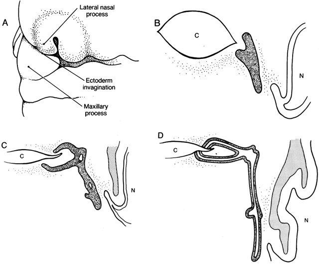 The main lacrimal gland forms from solid epithelial cords of conjunctiva superolaterally.21 The lacrimal gland develops at the 25-mm stage as epithelial buds evaginating from the basal cells of the conjunctiva in the superotemporal portion of the embryonic fornix. Initially solid cords are formed, but by 3 months' gestation the central cells begin to vacuolate and lumina appear. The lateral horn of the aponeurosis of the levator palpebrae superioris muscle divides the lacrimal gland into a superficial palpebral and a deeper orbital lobe at the 5th month of gestation. Full differentiation of the lacrimal gland is achieved only during the 3rd and 4th years postnatally. Note that lacrimal gland tissue is composed of two embryologic anlagen; the ectodermal glandular units are surrounded by mesodermal muscular (myoepithelial) and fibrous tissue. An abnormal growth of both glandular and mesenchymal portions forms a pleomorphic adenoma (benign mixed tumor). Development of the lacrimal gland differs from that of the salivary glands in that the former, as already mentioned, is derived from surface ectoderm whereas the latter are embryologically related to stomodeal epithelium. This may at least in part account for the different incidence of specific tumor types in the lacrimal gland and the salivary glands, despite their similar histologic appearance.25 |