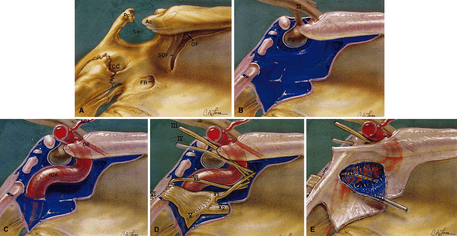 CLINICAL PRESENTATIONS AT THE ORBITAL APEX Before neuroimaging by CT and MRI, several clinical syndromes were used to describe lesions at specific sites of the cranio-orbital junction. Because of the widespread availability of neuroimaging today, these various clinical subtleties are less important. However, a clear understanding of cranio-orbital anatomy requires a knowledge of possible clinical manifestations. In general, cranio-orbital syndromes may be described as superior orbital fissure syndrome, orbital apex syndrome, and cavernous sinus syndrome (Fig. 15).7,8 The distinction between these presentations depends on the involvement of CN V-2, the sympathetic nerves, and the optic nerve (Table 8). It is much easier simply to call the constellation of signs of cranio-orbital disease the parasellar or sphenocavernous syndrome, rather than attempting to be too specific in an area where the clinical presentations are seldom as distinct as described in Table 8.