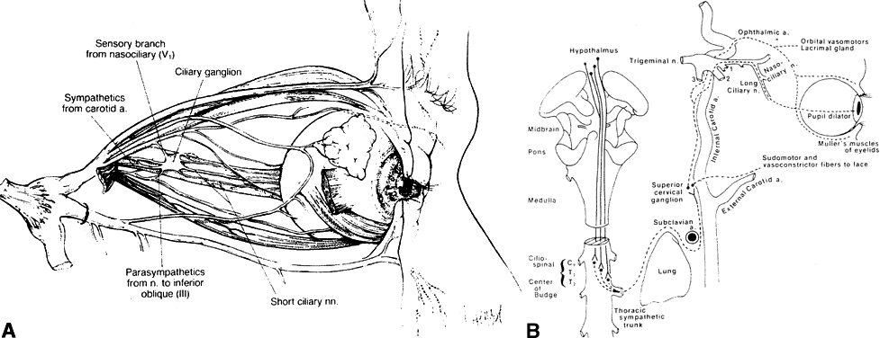 SYMPATHETIC INNERVATION OF THE ORBIT The sympathetic chain travels into the calvarium as a plexus surrounding the ICA.6 Within the CS, nerve fibers leave the carotid siphon to enter the orbit through two routes (see Fig. 14B):