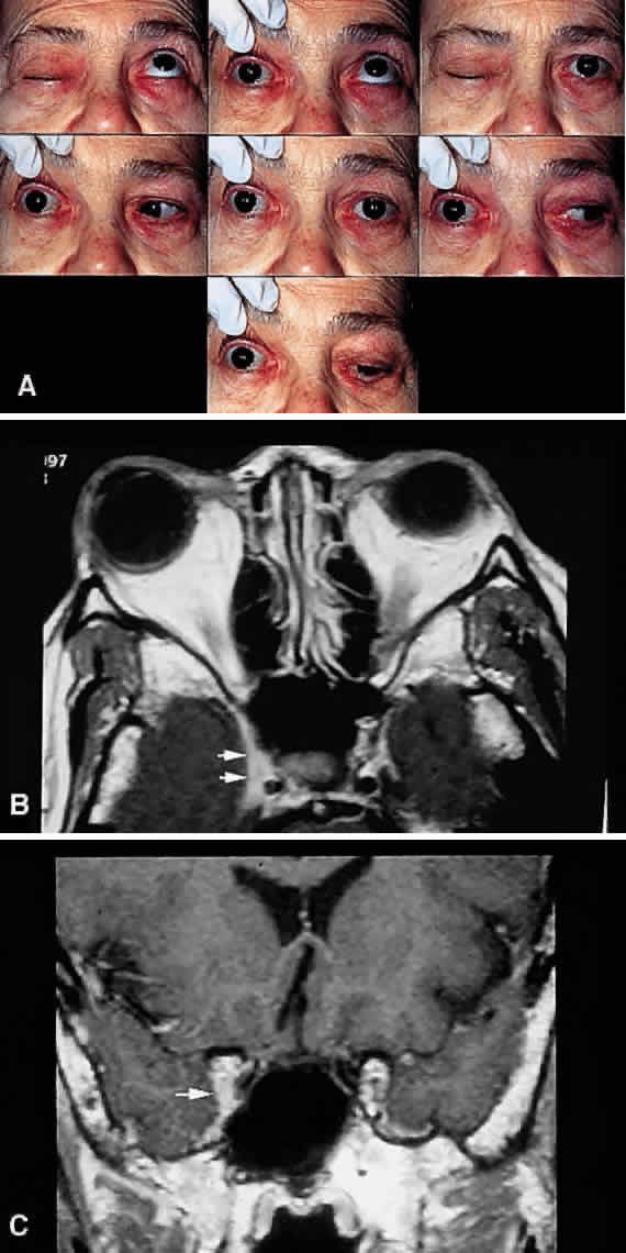 The differential diagnosis for parasellar syndrome is listed in Table 9, but two points are worth stressing. First, the most common neoplasias by far of this region are meningiomas and pituitary adenomas. Second, the diagnosis of Tolosa-Hunt syndrome is often misused. This specific entity is rigorously defined as granulomatous inflammation around the carotid siphon (resulting in the clinical findings of a painful parasellar syndrome).9,10 In general, Tolosa-Hunt syndrome is responsive to corticosteroid therapy11,12 but is not equivalent to orbital apical pseudotumor (nongranulomatous inflammation). Further, Tolosa-Hunt syndrome is a diagnosis of exclusion and should never be applied liberally.13 Remember that other entities, including meningiomas, aneurysms, and even infection, have been reported to respond to corticosteroids (i.e., misdiagnosed as Tolosa-Hunt syndrome).