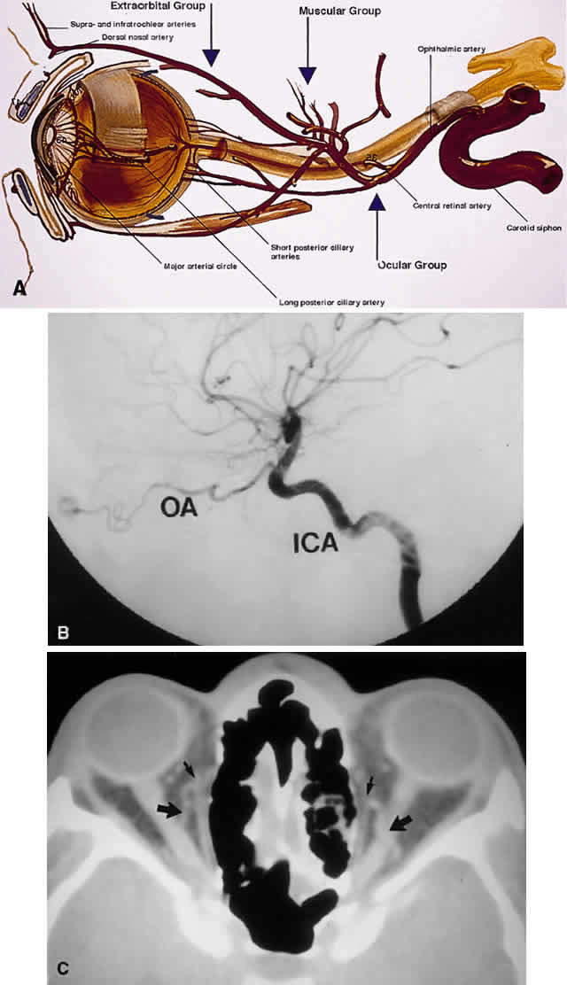 Second, the motor fibers to the EOMs usually enter the inner aspect of each muscle at the junction of the posterior one third and the anterior two thirds of the muscle's length. The exception is the nerve to the inferior oblique, which runs along the lateral aspect of the inferior rectus muscle to enter the inferior oblique muscle near the globe's equator (see Fig. 14). This nerve may be damaged with manipulation of inferior orbital soft tissue during repair of an orbital floor fracture. Because the parasympathetic fibers of the pupil also travel with the nerve to the inferior oblique at the orbital apex, any anterior traction may cause contusion to these more posterior fibers, resulting in a postoperative Adie's pupil.14 VASCULAR SUPPLY Arteries The tissues of the orbit and periorbital region derive their blood supply from two sources—the internal and external carotid arteries.15 Although the majority of orbital blood supply comes from the ICA, anastomoses with external carotid supply are numerous. The ICA enters the calvarium through the foramen lacerum, runs near the posterior clinoid process, and then makes a sharp turn to enter the CS with the abducens nerve (see Fig. 13). As already noted, within the CS the ICA has an S-shaped course called the carotid siphon. As the ICA exits the CS, it gives off its first major intracranial branch, the ophthalmic artery. Before giving off the ophthalmic artery, the ICA has several minor branches that supply the meninges, including the dura of the lateral wall of the CS. An abnormal communication between the arterial and venous supply of the CS results in either a carotid-cavernous fistula or a dural-sinus fistula (Fig. 18A). Because of the larger caliber of the ICA, a carotid-cavernous fistula is usually symptomatic secondary to a high flow state, possibly manifesting as orbital/ocular ischemia and increased intraocular pressure. This type of fistula is most commonly encountered in younger patients after blunt trauma and may require invasive neuroradiologic treatment (Fig. 18B). Conversely, a dural-sinus fistula is typically a low-flow state because the abnormal communication forms between the small-caliber dural arterial feeders of the lateral CS wall and the venous plexus of the CS. Such fistulas are usually seen in older individuals as a spontaneous event. Depending on the severity of symptoms, most dural sinus fistulas are simply followed by observation because of the high rate of spontaneous closure. The ophthalmic artery enters the optic canal inferolateral to the optic nerve, carrying with it a sympathetic plexus from the ICA. The intraorbital course of the ophthalmic artery is highly variable. In about 83% of cases, the artery crosses over the optic canal from lateral to medial and continues to travel superomedially in the orbit to its terminal branches. While still within the orbit, the ophthalmic artery gives off several branches.16 These are most easily subdivided into three groups: ocular, muscular, and extraorbital (Table 12, Fig. 19).