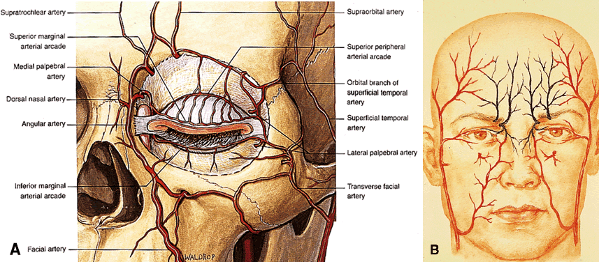 The optic nerve derives its blood supply from three sources: the central retinal artery, the pial perforators, and the short posterior ciliary arteries.17 Note that the two long posterior ciliary vessels do not supply the optic nerve. Instead, they travel anteriorly within their scleral canal to supply the major arterial circle of the globe located at the iris root. The major arterial circle is also supplied by the terminal branches of the seven muscular arteries, which enter each rectus muscle with the motor nerve at the posterior third of the muscle. Note that the lateral rectus muscle has only one muscular artery but derives an additional blood supply from the lacrimal artery. The extraorbital or anterior arterial circle includes the ethmoidal arteries, which act to tether the ophthalmic artery to the medial wall of the orbit, and terminal branches which exit the orbit anteriorly to anastomose with the external carotid arterial supply of the face. The anterior and posterior ethmoidal vessels are important landmarks during medial orbitotomy. Because their ostia run through the frontoethmoidal suture, they are found at the level of the cribriform plate (skull base) (see Fig. 7). The anterior to posterior location of these arteries is also an important guide to the optic foramen: the anterior ethmoidal artery is located 24 mm posterior to the anterior lacrimal crest, the posterior ethmoidal artery is 12 mm posterior to the anterior ethmoidal artery, and the optic foramen is 6 mm posterior to the posterior ethmoidal artery. Thus, remembering the numbers 24-12-6 is helpful as a guide to the optic foramen. The terminal branches of the ophthalmic artery are the supratrochlear, infratrochlear, and dorsal nasal arteries, which supply the glabella and medial canthus and form the medial half of the palpebral arcades (Fig. 20A). The dorsal nasal artery (ICA) anastomoses with the facial artery (external carotid artery) to form the angular artery, often encountered during dacryocystorhinostomy. The terminal arteries of the orbit exit around the orbital rim to form three main anastomoses with the external carotid arterial supply of the face, namely with the facial artery, the superficial temporal artery, and the maxillary artery (see Fig. 20B). The eyelids are supplied chiefly by palpebral arcades that course across the lids from medial and lateral arteries. In most cases, the upper eyelid contains two arcades, the marginal and peripheral, whereas the lower eyelid contains only one arcade, the peripheral. The peripheral arcades are found at the peripheral border of each tarsal plate, lying between the eyelid retractors. In the upper eyelid, the peripheral arterial arcade is commonly encountered during levator surgery between the levator aponeurosis and Müller's muscle. The medial palpebral artery pierces the orbital septum and follows a tortuous course through the medial fat pad of the upper eyelid as it anastomoses with deeper orbital vessels.35 Clamping of the medial fat pad before excision is important in preventing excessive bleeding during upper eyelid surgery. A summary of important vascular characteristics of the orbit is found in Table 13.