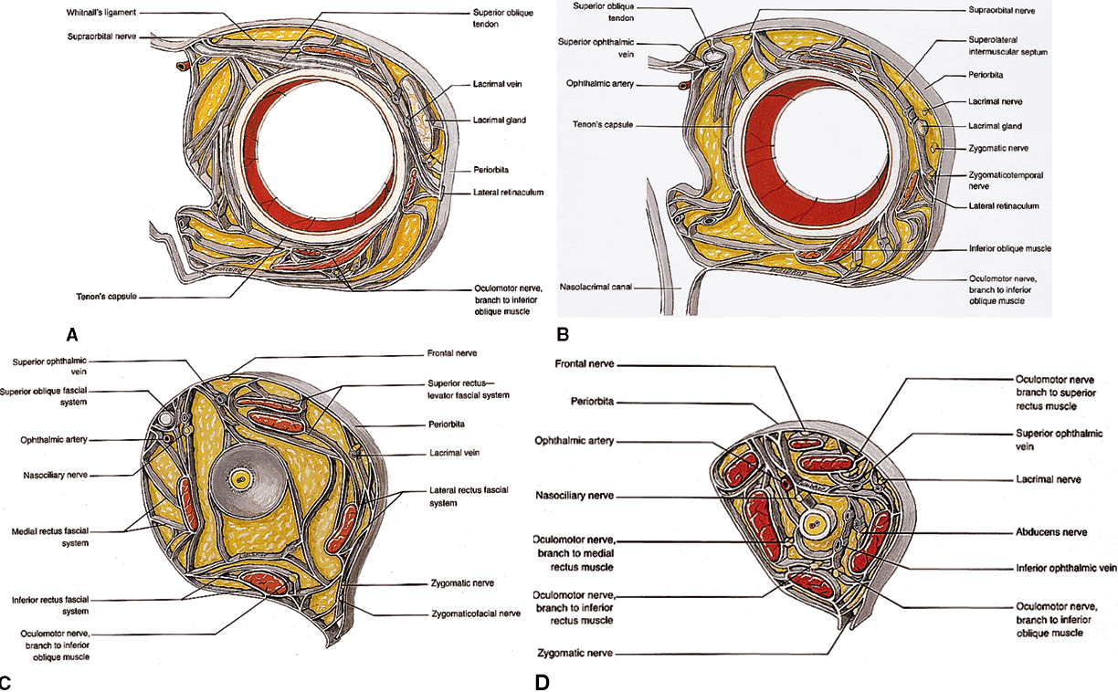 Veins Within the soft tissue of the orbit, venous drainage is distinctly separate from the arterial supply; a similar arrangement is found intracranially. Although the veins are found in a relatively reproducible pattern within the orbital septal system, the arteries travel more haphazardly within orbital fat.18 All orbital veins are valveless; this may facilitate more rapid posterior spread of infectious processes within the anterior orbit. The major venous drainage of the orbit is the superior ophthalmic vein and the CS (Fig. 21). The superior ophthalmic vein follows a medial-to-lateral route posteriorly along the superior orbit, tethered beneath the superior rectus muscle by a fascial sling.19 At the orbital apex, it is usually joined by the inferior ophthalmic vein, which also communicates through more minor branches with the pterygopalatine plexus through the IOF. The central retinal vein typically drains directly into the CS without joining the superior ophthalmic vein. Anteriorly, the orbit also drains into the angular vein of the facial plexus. Lymphatics To date, no lymphatic system has been identified within the human orbit, although recent studies that identified lymphatic drainage in primate orbits make this an intriguing possibility.20 In the eyelids, lymphatic drainage occurs through a deep (posterior lamellar) and superficial (anterior lamellar) system. The medial aspect of the eyelids drains into the submandibular lymph nodes, whereas the lateral aspect and most of the upper eyelid drain into the preauricular and parotid nodes. EXTRAOCULAR MUSCLES AND ORBITAL FASCIAL SYSTEM The EOMs insert 5.5 to 8 mm behind the limbus of the globe. Specific details regarding the dimensions and functions of each EOM are found elsewhere. Useful points are summarized in Table 6. The EOMs are striated and composed of aerobic, twitch-type Fibrillenstruktur fibers and anaerobic, tonic-type Felderstruktur fibers.36,37 The most common affliction of the EOMs is inflammatory myositis, which is seen most typically in thyroid-related orbitopathy and idiopathic inflammatory pseudotumor. Rhabdomyosarcoma, a tumor with focal striated muscle differentiation that generally occurs in children, appears to arise from indifferent orbital mesenchyme rather than from preformed and completely differentiated striated muscle fibers. Landmark anatomic investigations by Koornneef38–40 have shown that there are highly elaborate and reproducible connections of the epimysium of the EOMs with the fibrous connective tissue system of the orbital fat, the epibulbar fascia of Tenon's capsule, and the periosteum (periorbita) (Fig. 22). This extensive yet reproducible network of connective tissue provides support for the delicate neurovascular structures traversing the orbit, both facilitates and restricts the movement of EOMs in a coordinated fashion, and compartmentalizes the orbit into various spaces. Because of the inherent complexity of the orbital connective tissue system, any disruption in one area of the orbit may cause significant dysfunction of more distant areas. For example, these connections become clinically important in the understanding of restricted motility after orbital wall fracture and orbital decompressions for Graves' orbitopathy, as well as the superior sulcus and lower eyelid deformities that follow enucleation and orbital implant placement. To promote a clearer understanding, Dutton has succinctly summarized the orbital connective tissue system by dividing it into three components: Tenon's capsule, the anterior orbital suspensory system, and the posterior orbital suspensory system.41 The three components should not be considered as distinct anatomic entities, because complex attachments unite this triad into one comprehensive unit. Tenon's capsule begins anteriorly just posterior to the limbus with firm attachments to the underlying episclera, investing the globe in an elastic and vascular connective tissue cover. The capsule also encompasses the anterior portions of the EOMs. Posteriorly, Tenon's capsule surrounds the optic nerve, interdigitating with the dural sheath. Other than its anterior and posterior attachments to the globe, Tenon's capsule is only loosely adherent to the underlying sclera, thereby cushioning the movement of the globe. An intermuscular fibrous membrane connects the four rectus muscles around the globe to create a distinct intraconal space, but in the deeper orbital tissues this membranous system is not complete, so that the distinction between a central and a peripheral orbital space is lost toward the orbital apex. Anteriorly, the intermuscular fibers also blend with Tenon's capsule, creating a sort of rotating sleeve around the globe during ocular rotations. The anterior orbital suspensory system is primarily concerned with providing support for the globe and fixation for eyelid structures. In addition, fascial support exists for the lacrimal gland (Sommering's ligaments) and the superior oblique muscle in the area of the trochlea. The four main structures of the anterior system are Whitnall's suspensory ligament, Lockwood's ligament, and the medial and lateral canthal tendons. These structures are discussed in detail elsewhere. The anterior suspensory system also provides anchoring points for the check ligaments of the EOMs, limiting their overaction during ocular rotations. As already noted, the orbital septal system becomes less defined more posteriorly. The well-defined intraconal space encountered anteriorly blends with the surrounding extraconal space as one approaches the orbital apex. The annulus of Zinn, discussed earlier, forms dense adhesions to the periosteum of the orbital apex around the optic canal and SOF (see Fig. 12). In addition, fibers pass inferiorly along the IOF to interdigitate with Müller's orbital muscle, which spans the fissure. As the levator palpebrae superioris (levator) muscle and superior rectus muscle course anteriorly, diffuse connectio