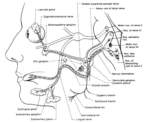 nervus intermedius of Wrisberg. SUPRANUCLEAR SEGMENT Facial movement is a complex operation that involves input from both pyramidal and extrapyramidal areas.3 The extrapyramidal circuits involve the premotor cortex, parietal cortex, temporal cortex, cingulate gyrus, hippocampus, amygdala, hypothalamus, basal ganglia, cerebellum, and midbrain tegmentum. These varied connections help explain the tight association of facial movement with emotions and the limbic circuit, as well as the apparent paradox seen in persons who have lost voluntary control of facial movement yet may laugh normally upon hearing a joke. The cortical area that subserves volitional facial movement is located in the lower third of the precentral gyrus, with representation of the upper face situated rostral to the lower face. Both crossed and uncrossed fibers descend to the upper face, whereas only crossed fibers descend to the lower face (Fig. 1). As a result, unilateral hemispheric lesions spare the forehead and orbicularis musculature.4,5 These descending motor fibers unite in the internal capsule, decussate in the pons, and terminate in the facial nucleus, which is located in the lateral tegmentum of the caudal pons.6 Ascending sensory fibers traveling in the medial lemniscus synapse in the ventral posterior medial nucleus of the thalamus. Medial lemniscal fibers originate in the nucleus solitarius, the gustatory gray of the spinal tract of nerve V, and the main sensory nucleus of nerve V. Much of the primary sensory information is interpreted by the thalamus, while other information is relayed to the postcentral gyrus of the parietal cortex for more complex sensory interpretation. An extensive number of connections within the brain stem are also made, allowing for a richly diverse pattern of reflexes. Lastly, muscle spindle information probably reaches the cerebellum from the mesencephalic nucleus of nerve V in the caudal midbrain. NUCLEAR SEGMENT The facial motor nucleus extends approximately 3 to 4 mm in length; its caudal portion is an extension of the nucleus ambiguus, and its rostral portion reaches the abducens nucleus dorsomedially and the motor nucleus of nerve V laterally.7 In its rostral extent is found a separate, discrete bunch of large multipolar cells representing the accessory facial nucleus.8 Both nuclei control motor function. Running rostromedially and dorsally, these motor fibers sweep around the abducens nucleus to form the internal genu, which bulges into the fourth ventricle. On its course laterally to exit the brain stem, the nerve passes by the superior salivatory nucleus, where visceral motor fibers destined for the submandibular and sphenopalatine ganglia are picked up by the facial nerve.3,9 Sensory information is transported to the brain stem via small, medium, and large fibers. Each specializes in a different sensory modality, and each synapses on a different sensory nuclei in the brain stem or cervical cord. The terminology of the brain stem can be confusing because many of the tracts and nuclei serve many different cranial nerves (see next paragraph). Yet, these structures are often named after the cranial nerve with the largest input (i.e., descending tract of nerve V). The descending tract of nerve V and associated gray receive small fiber somatic pain and temperature input from cranial nerves V, VII, IX, and X. The solitary tract and nucleus receives small fiber visceral information from the nasal mucosa and anterior two thirds of the tongue, as well as information from nerves IX and X. The main sensory nucleus of nerve V receives medium fiber somatic input for light touch and vibration from both nerves V and VII. Large fiber muscle spindle information is much less clearly defined, but many believe that the mesencephalic nucleus of nerve V receives this input.3,10 INFRANUCLEAR SEGMENT: MOTOR ROOT Within the cerebellopontine angle, the somatic motor component of the facial nerve (motor root) is closely approximated to the nervus intermedius and the auditory nerve. Enclosed in a leptomeningeal sheath that contains an extension of the subarachnoid space, the three nerves enter the internal auditory meatus, traveling laterally.11 At the point of entry, the nervus intermedius is between nerve VIII and the motor root. The motor root and nervus intermedius enter the facial canal (aqueduct of Fallopius) within the substance of the temporal bone and then widen to form the geniculate ganglion. It is in the geniculate ganglion where the first parts of the nervus intermedius (see next section) diverge, while other parts continue with the motor nerve (Fig. 2). The motor nerve then turns posteriorly at a sharp angle, forming the external genu. After the genu, the nerve enters the tympanic (horizontal) portion of the facial canal. This is located below and medial to the horizontal semicircular canal and above the pyramidal eminence that houses the stapedius muscle. The proximal part of this segment is housed behind a fragile, easily fractured tympanic wall; this is a common site of facial nerve damage in traumatic head injuries. Not infrequently, the nerve prolapses into the oval window niche, partly or completely concealing the footplate of the stapes. This anomaly is of clinical importance when the stapes is removed or manipulated during ear surgery.12 At the posterior aspect of the middle ear, the nerve curves downward at which point a branch innervates the stapedius muscle. This minute muscle acts to dampen wide acoustic input surges from the delicate bony transmission system. The downward course takes it into the anterior wall of the mastoid process of the temporal bone. It is within this segment that the chorda tympani arises and marks the final separation of fibers that form the nervus intermedius. The chorda tympani transmits afferent taste sensation and efferent parasympathetic fibers to the submandibular ganglion (also known as the submaxillary ganglion; see Fig. 2). The motor nerve cont