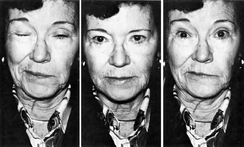 Several explanations for the progressive atrophy have been put forth, and all of them may be correct. These include trauma, sequelae of irradiation, infection, scleroderma, sympathetic dysfunction,75 lupus erythematosus,76 trigeminal neuropathy, and lymphocytic neurovasculitis.73,77–79 Recent microscopic and biochemical analyses of connective tissue are beginning to find clues.77,79 MRI data were reported recently by Terstegge and associates.80 In cases in which MRI abnormalities were found, a high majority of these abnormalities were ipsilateral to the hemifacial atrophy, supporting the lymphocytic neurovasculitis theory. Cerebral hemiatrophy was the most common finding; gliosis, cortical calcification, and meningeal enhancement were also seen. These findings help explain why seizures, when present, are most often contralateral to the facial atrophy. The overwhelming majority of MRI findings were seen in patients with symptoms involving the central nervous system; most asymptomatic patients had normal scans. Currently, treatment is limited to either chemotherapy, if an underlying autoimmune cause is found, or surgical reconstructive techniques after progression of the atrophy has halted.81 Surgical options include free flaps and lipofilling. DISORDERS OF OVERACTIVITY In any evaluation of unusual facial movements, the synkinetic movements seen after aberrant regeneration and the reflex grimacing movements created by trigeminal irritation must be considered first. Synkinetic Movements Synkinesis is defined as an unintentional movement following the initiation of volitional movement. The term is most often applied to the mass movements that follow incomplete recovery from Bell's palsy. (It also has been used, perhaps inaccurately, to describe hemifacial spasms that can occur spontaneously, without prior volitional movement.) Axonal compression or disruption along the course of the facial nerve may lead to involuntary or synkinetic movements. Several theories have been put forth, including facial nuclear reorganization, aberrant regeneration, ephaptic (false synapse) transmission, and kindling. All explain some components of involuntary facial movements, and electrophysiologic studies provide support for each theory.82–86 No single theory, however, is able to explain all aspects of this complicated subject. Only a simple overview will be provided here (please see the appropriate references for more details). Facial nuclear reorganization refers to the process whereby deafferentation changes nuclear inhibitory connections, thereby “unmasking” reflex movements.84 The complex nature of synkinesis is best explained by a nuclear origin. Aberrant regeneration refers to the resprouting of axons down incorrect myelin sheaths after nerve disruption. Ephaptic transmission refers to the concept of an “artificial synapse” between contiguous nerves, caused by the lateral spread of extra-axonal current through the interstitium.82,83 Current spread may occur between efferent fibers, or from afferent to efferent fibers, and the impulse may be transmitted in either direction along the nerve. Ultimately, misdirected neural firing leads to the synchronous contraction of unassociated muscle groups. Finally, kindling incorporates the concepts of both ephaptic transmission and nuclear reorganization, whereby an antidromic impulse from the ephapse of the nerve activates the facial nucleus, which then coordinates facial muscle contraction.86 As noted in the section on Bell's palsy, several complications involving the above mechanisms can occur after peripheral facial nerve disruption. Eye closure when eating or smiling as well as elevation of the corner of the mouth upon blinking are the most common forms of synkinesis, and become apparent within weeks to months of the insult. Unilateral lacrimation while eating is a complication referred to as crocodile tears and is an example of aberrant regeneration. Fibers of the nervus intermedius destined originally for the submandibular ganglion, become misdirected to the lacrimal gland via the greater superficial petrosal nerve; this suggests involvement of the facial nerve prior to the geniculate ganglion.87 Hemifacial spasm is a rare, if at all existent, complication of facial nerve palsy, and may be very hard to distinguish from the synkinetic movements that follow facial nerve palsy.45 In addition to the history of previous palsy, close observation may help with this distinction, since the synkinesias accompanying Bell's palsy are invariably produced only after voluntary movement, whereas hemifacial spasms can be self-perpetuating, as noted above.88 In the more mild forms of synkinesis, reassurance is the best treatment. When the contractures are cosmetically upsetting, botulinum toxin is the treatment of choice.89,90 Reflex Blepharospasm Irritation of any branch of the trigeminal nerve may lead to a bilateral orbicularis oculi reflex spasm. This may be incorrectly labeled as essential blepharospasm initially (see Essential Blepharospasm section), resulting in potentially treatable underlying disorders going unrecognized. Patients with anterior segment ocular inflammation or meningeal inflammation (caused by subarachnoid hemorrhage or meningitis) may present with referred pain in the first trigeminal division and reflex blepharospasm. Eye irritation and photophobia may be initial complaints. Patients with reflex blepharospasm do, however, have volitional control over their squinting. Because the lid closure is secondary rather than primary, they prefer to keep their eyes closed; however, in the disorders of overactivity to be discussed next, patients present with a primary complaint of eyelid closure. Supranuclear Disorders HABIT SPASM OF THE FACE (NERVOUS TWITCH, FACIAL TIC). Although frequently confused clinically with blepharospasm or hemifacial spasm, habit spasm of the face can be easily identified. The onset typically occurs in childhood and is charac