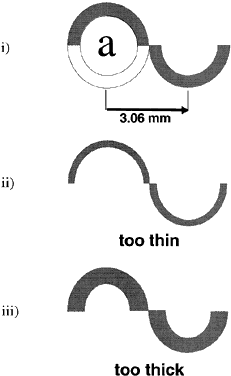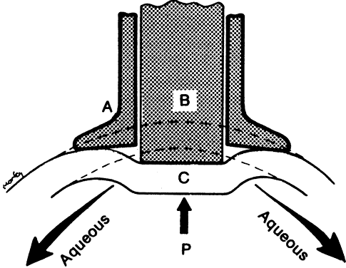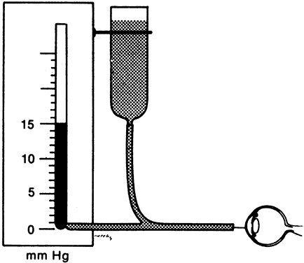 its advantages and disadvantages, and none is ideal. Some general principles apply to any method of measuring intraocular pressure. Extraneous factors that can influence the pressure reading must be avoided. The fingers of the examiner can press on the eyelid or eye while holding the lids apart, raising the intraocular pressure. Squeezing of the eyelids, eye movements, a tight collar or necktie, and repetitive measurements, particularly with Schiotz tonometry, can affect the intraocular pressure reading. MANOMETRY Intraocular pressure is higher than atmospheric pressure; therefore, if a small hollow needle is inserted into the anterior chamber, aqueous humor flows out through the needle. If the needle is attached to a reservoir of fluid that is raised just high enough to prevent any loss of aqueous, the height of the column of fluid, usually calibrated in centimeters of water or millimeters of mercury, reflects the intraocular pressure (Fig. 4). Movement of the fluid column caused by changes in intraocular pressure can be detected by an electronic strain gauge. Manometry is most used as a laboratory technique in performing continuous pressure measurements over time, evaluating the effect of physiologic and pharmacologic manipulations on pressure, and studying aqueous humor dynamics in postmortem eyes.4,121 The ethical use of manometry in living human eyes is restricted to eyes undergoing enucleation or intraocular surgery.122 This places constraints on the length of time manometry may be performed. In addition, these eyes may harbor significant ocular pathology affecting intraocular pressure. Intraoperative data obtained from diseased eyes may not apply to normal eyes. APPLANATION TONOMETRY The pressure inside a flexible sphere with thin walls can be closely approximated by knowing the force necessary to just flatten (applanate) a given area of the sphere. These parameters are related by the formula, pressure = force/area (Imbert-Fick law). One can either measure the force necessary to flatten a fixed area or measure the area flattened by a fixed force. Both methods have been used in designing tonometers (Fig. 5).1,4 Fixed-Force Tonometers Maklakoff in 1855 developed the first practical applanation tonometer.1 This instrument was a metal cylinder of known weight with a flat bottom. A dye was smeared on the anesthetized cornea and with the patient supine, the cylinder was allowed to rest on the cornea. The applanated area of cornea transferred the dye to the tonometer, and the area of applanation could be calculated from the diameter of the circle of dye on the tonometer bottom. The pressure could be derived from the Imbert-Fick formula because the applanating force (the weight of the tonometer) was known. The Maklakoff tonometer has several disadvantages. The relatively large applanation area and heavy weight of this tonometer raises the intraocular pressure above its resting state (Po) to a higher level (Pt) during measurement. The Maklakoff tonometer records this higher pressure (Pt) rather than the “undisturbed” intraocular pressure (Po). It is possible to calibrate the tonometer in such a way as to derive Po from Pt but it must be assumed that most eyes respond in the same way to tonometer placement. Also, the slightest movement of the eye or examiner smears the ink spot, making it larger than the actual area of flattening. This leads to an underestimate of the intraocular pressure.1,2,4 Posner has revived this kind of tonometer for clinical use (Fig. 6).123 His version is plastic, which reduces its weight and the discrepancy between Po and Pt. Ink is smeared on the tonometer footplate. When the tonometer rests briefly on the eye, the ink from the footplate is transferred to the flattened area of the cornea. The area on the footplate that is devoid of ink corresponds to the area of applanation. The footplate is then pressed onto a sheet of paper, and the diameter of the inkless area may be converted to the intraocular pressure. The Posner-Inglima tonometer has the advantage of being inexpensive and disposable. It can be used at home or whenever cleaning and sterilization of a tonometer are impractical. Fixed-Area Tonometers GOLDMANN APPLANATION TONOMETRY. In 1888, Fick devised a tonometer that maintained a fixed area of applanation.124 The intraocular pressure was determined by measuring an adjustable force necessary to flatten this predetermined area of the corneal surface. In the 1950s, Goldmann modernized this concept and developed the tonometer that has become the standard against which all others are judged.125 The applanating surface of the Goldmann tonometer has a diameter of 3.06 mm placed in the center of a plastic cylinder of 7 mm total diameter. The plastic cylinder is attached to an arm pushed forward through a spring-loaded knob. The amount of force on the cylinder is precisely controlled and can be read from a scale on the knob. The device is mounted on a slit-lamp biomicroscope (Fig. 7).1,4 To determine the intraocular pressure, topical anesthetic and fluorescein dye are placed in the eye. The dye mixes with the tears and fluoresces a brilliant yellowish green when activated by cobalt blue light. When the corneal surface is flattened by the plastic cylinder, the tear layer is squeezed out from the applanated surface, and the tear meniscus is seen through the clear center of the plastic cylinder as a ring of fluorescence. The force knob is adjusted until the applanated area is exactly 3.06 mm in diameter. The Goldmann tonometer uses an ingenious optical method to allow this adjustment to be precise: two prisms are positioned in the plastic cylinder, apex to apex, in such a way that the fluorescent ring of the tear meniscus is seen as two half rings (mires), one above and one below. The orientation and power of the prisms are such that the two mires are optically separated by exactly 3.06 mm. The force knob is turned until the inside edges of the end of each split ri
