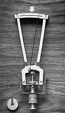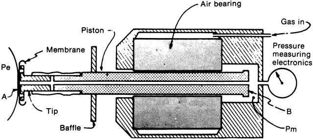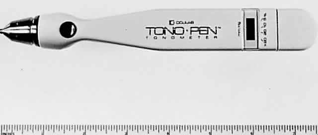 Scleral rigidity can be calculated from the Friedenwald nomogram as follows (see Fig. 11): Two different weights are used to obtain two tonometer scale readings (two different values for Pt). A more accurate method is to use the applanation tonometry value as Po and one Schiøtz reading as Pt. The slope of the line formed by joining these two points gives the scleral rigidity (mmHg change in pressure per cubic mm change in volume). In clinical practice, scleral rigidity measurements are not made as often as they should be. This introduces significant errors and makes dependence on Schiøtz tonometry hazardous. Errors of Schiøtz Tonometry In addition to the potentially large error that an abnormal scleral rigidity can produce in Schiøtz tonometry, other errors may arise. The footplate must be the right curvature and size, and the total instrument must be the correct weight for the Friedenwald tables and nomogram to apply.2 Poor attention to detail in manufacture can make a tonometer totally unreliable. The American Academy of Ophthalmology has established a Committee on Tonometer Standardization, which has set rigid criteria for Schiøtz tonometers. A tonometer certified by this committee or by a laboratory committed to the same standards can be expected to perform reliably. Dirty tonometers are also potentially inaccurate. If tears inside the barrel are allowed to dry, the friction between the barrel and plunger is increased. A common error is to autoclave the tonometer without first carefully cleaning it. The secretions in the barrel harden, causing the plunger to stick. If the tonometer is not placed perpendicular to the corneal surface, additional friction is produced between plunger and barrel. A cornea that is scarred, edematous, or of abnormal curvature gives inaccurate readings with the Schiøtz. A corneal abrasion can be caused by the plunger if the eye or tonometer moves during measurement. The Schiøtz tonometer must be used in the supine position or in the sitting position with the head back far enough to be horizontal. An initial blink or avoidance reaction may occur as the patient sees the tonometer descending toward his or her eye. Despite the many potential sources of error, the Schiøtz tonometer has been a remarkably useful instrument for the past 75 years. Compared with most other methods of tonometry, it is inexpensive, simple, portable, and easily sterilized. Patients and their families can be taught how to use it for home tonometry. Although largely replaced in the United States by Goldmann or other types of tonometry, the Schiøtz tonometer still has a place in clinical practice, particularly if checked for accuracy against Goldmann tonometry in each patient. COMBINATION APPLANATION-INDENTATION TONOMETRY The McKay-Marg, Tono-Pen (Intermedics Intraocular, Pasadena, CA), and pneumotonometer instruments have properties of both applanation and indentation tonometers. The original McKay-Marg tonometer is no longer manufactured and has been supplanted by a handheld and battery-operated version, the Tono-Pen. Mackay-Marg Tonometer The Mackay-Marg tonometer uses a microplunger that protrudes a small amount from a flat footplate of a tubular handpiece (Fig. 13). The microplunger is connected to a sensitive transducer, which converts plunger displacement into an electrical signal that is recorded on a paper chart, much like an electrocardiogram.4,156 The shape of the tracing reflects the stages of applanating the cornea (Fig. 14). As the plunger is pressed into the cornea, both intraocular pressure and corneal elasticity push back, as with the Schiotz tonometer. During this phase of measurement, a rising trace is recorded. When the plunger no longer protrudes from the footplate, the footplate has applanated the cornea. The force of corneal elasticity is taken off the plunger, resulting in a slight drop in the trace. As the plunger and footplate are pressed farther into the cornea, the unit raises intraocular pressure by displacing aqueous humor, and a rise in the pressure is again recorded. The true intraocular pressure, Po, representing the point of applanation, is the bottom of the trough in the pressure recording. Note that there is no disturbance of the intraocular pressure until this point is passed.3,157,158 The Mackay-Marg tonometer is the most accurate tonometer in scarred or edematous corneas because the intraocular pressure reading is independent of corneal elasticity.159 This has been confirmed manometrically. The end point is measured electrically; therefore, the reading is unaffected by optical factors such as an irregular cornea or high astigmatism. Several readings may be required to obtain a good tracing, however, and the interpretation of the readings may be difficult.2 The values from Mackay-Marg tonometry correlate well with those from Goldmann tonometry.6 The mean values from the Mackay-Marg tonometer, however, may be 1.5 to 3 mmHg higher than those from the Goldmann tonometer on normal corneas.2 One study160 has seriously questioned the reliability of individual readings but most studies indicate a reasonable degree of reliability.2,4 Phelps and Phelps pointed out that even with Goldmann tonometry there may be significant variation from reading to reading in the same patient within a short time.161 Tono-Pen The Tono-Pen is a handheld, battery-operated version of the Mackay-Marg tonometer (Fig. 15). The tip is covered by a disposable latex cover and applied perpendicularly to gently indent an anesthetized cornea. Each measurement requires several applanations. An acceptable applanation is indicated by an audible click after contact with the cornea. A microprocessor averages several acceptable waveforms and gives a digital readout of intraocular pressure on a liquid crystal display, with an estimate of the variability between the component readings. Studies comparing the Tono-Pen with the Goldmann applanation tonometer revealed a reasonable correlation be
