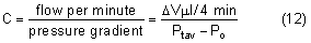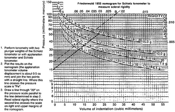 law, which describes the flow through a system of straight, rigid tubes.1,4 This equation, states that flow is proportional to the pressure difference across the tube or tubes, the number (n) of tubes, and the fourth power of the radius (r) of tubes connecting the two ends of the system. Flow is inversely proportional to the length of tubes (l) and the viscosity (η) of the fluid in the system. In a fixed system such as the eye, r, n, η, and l are constants and equation 1 simplifies to where R is a resistance constant given by, This resistance constant can also be written as its reciprocal, the coefficient of outflow facility (C), The values derived from the assumption that the living eye behaves like a system of rigid tubes approximate what occurs in vivo, and this model has been helpful in understanding some of the basic mechanisms of aqueous humor dynamics. In the eye, P1 equals the intraocular pressure and P2 is the EVP. So the basic equation for aqueous outflow becomes Assuming EVP remains constant, aqueous flow increases as intraocular pressure increases. Under steady-state conditions, inflow and outflow are equal. The equation for inflow (Fin) is where Pa is ciliary artery pressure and Cin is the facility of inflow.1,2,4 The uveoscleral outflow is independent of intraocular pressure.174,175 Under normal conditions, uveoscleral outflow comprises less than 10% of the total outflow and is usually ignored. The true outflow is represented by the equation where U is the uveoscleral outflow rate. Changes in the volume of the aqueous or vitreous causes changes in the intraocular pressure because the intraocular fluid is contained within tissues that are not very expandable. The relation between intraocular fluid volume change and intraocular pressure change can be derived experimentally. Known volumes of fluid are injected in enucleated human cadaver eyes and the resulting pressures are measured manometrically. Multiple measurements with different injected volumes can be used to develop a relation between pressure change and volume change. Plotting the log of intraocular pressure versus volume change yields a straight line whose slope gives a measure of scleral rigidity. This relation is known as Friedenwald's formula, where E is the ocular rigidity coefficient, P1 is the starting pressure, P2 is the pressure after the ocular volume is changed, and ΔV is the change in volume.2,4 Friedenwald2,4 arrived at a value of 0.0215 for average ocular rigidity, the value used for Schiøtz tonometer tables and tonography. Unfortunately, ocular rigidity is not a constant and appears to decrease as intraocular pressure increases.1,176 Furthermore, the relations do not hold in the living eye because intravascular blood volume within the eye varies with intraocular pressure, and living tissue has viscoelastic properties. The Friedenwald relations work fairly well for clinical purposes, however, and reveal much about aqueous dynamics. The Friedenwald nomogram may be used to arrive at a value for ocular rigidity. Friedenwald equated the distortion produced by the indentation of the Schiøtz tonometer with a change in volume produced by fluid injection. Tonometry with different weights should produce different but characteristic distortions and volume changes. These changes should appear along a straight line on the log scale. The slope of this line is the scleral rigidity and can be found by drawing a line parallel to the line formed by the different tonometry scale readings through the arbitrary reference point for the nomogram (20 mmHg; see Fig. 11). The Friedenwald theory, data, and nomograms may also be used to estimate the facility of outflow.152 MEASURING THE FACILITY OF OUTFLOW Recalling the equation for aqueous flow and solving for outflow facility, Outflow facility is given as flow per minute per millimeter of mercury pressure gradient between the anterior chamber and episcleral veins. The normal human outflow facility is about 0.30 μl/min/mmHg.4 If the values for C, Po, and Pv are known, the flow rate F can be calculated. The C value quantitatively characterizes the aqueous drainage system, and its measurement is of interest in evaluating clinical states such as glaucoma. In addition, measurement of outflow facility can provide valuable information concerning the mechanism of action of pressure-lowering drugs and diverse physiologic factors that affect intraocular pressure.4 The C value can be determined by turnover of fluorescein or other tracers. These methods are somewhat tedious and subject to considerable errors. The other methods of determining C are perfusion, tonography, and suction cup. Only the latter two have practical clinical utility. PERFUSION In the perfusion method, useful in the laboratory, the living or enucleated eye is cannulated and known volumes of fluid can be injected under a known pressure (Pi).177 Outflow facility is simply calculated from the equation where Po is the undisturbed intraocular pressure. In the enucleated eye, Po is 0 mmHg. Perfusion studies, in vivo and in vitro, are independent of ocular rigidity and corneal curvature. The average human value for C obtained in vitro by this method is 0.28 μl/min/mmHg. Despite artifacts caused by cannulation, deepening of the anterior chamber by extra fluid injected, postmortem tissue changes, lack of blood flow, and alteration of aqueous secretion, the in vitro value correlates well with the values obtained in vivo by other techniques.4,5 TONOGRAPHY Tonography is based on the observation that pressing on the eye causes an initial increase in intraocular pressure, then a decrease. The Schiøtz tonometer is used both to cause the initial rise to Pt and to measure the subsequent fall in pressure. The rate of decline in intraocular pressure is a measure of the ease or difficulty with which fluid can be forced out of the eye by the weight of the tonometer. This process is similar to forcing air out of an air mattress. Pres