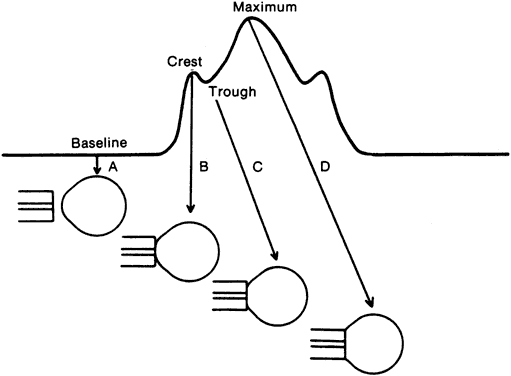 The intraocular pressure is a dynamic function like heart rate and blood pressure and is influenced by many factors. A single measurement of intraocular pressure does not necessarily reflect the average pressure in that hour, day, or week. DIURNAL VARIATION Intraocular pressure in humans follows a diurnal rhythm.4,8 Most commonly, the pressure is highest in the early morning (around 7 AM), and lowest in the evening (around 5 PM; Fig. 2) but considerable individual variation exists regarding the time of day or night when the peak and nadir occur.10–12 The intraocular pressure usually varies less than 5 mmHg from peak to nadir, although differences as large as 15 mmHg have been found. Some people with elevated intraocular pressure are found to have large diurnal peaks and troughs13 and can show variations of as much as 8 mmHg from hour to hour.14 Irregular sleep patterns alter the usual diurnal pattern of intraocular pressure.15 The diurnal pattern of intraocular pressure has been correlated with circadian rhythms of other functions, such as blood pressure, body temperature, and adrenal corticosteroid secretion. In many subjects, the intraocular pressure rises several hours after an increase in plasma adrenal corticosteroids.16,17 This pattern may be due to changes in both aqueous secretion and outflow resistance.18,19 The existence of diurnal variation implies that a single random intraocular pressure measurement does not adequately represent average pressure over a 24-hour period. Peak intraocular pressure can only be obtained by around the clock measurements or with measurements taken at different times of the day. In glaucoma patients, normal intraocular pressures recorded during office hours can give a false clinical impression of adequate pressure control.20–22 Phelps and colleagues argued that a single office pressure measurement was likely, though not certain, to be representative of the peak diurnal pressure.23 Zeimer, however, using Phelps and coworkers' data, calculated that the 95% confidence interval for such a prediction was ±6.6 mmHg, an uncertainty of more than 13 mmHg.12 A small (about 1.5 mmHg) seasonal variation in intraocular pressure has been described, with the highest pressures recorded in winter and the lowest in summer.23,24 INFLUENCING FACTORS The intraocular pressure is subject to numerous short- and long-term influences (Tables 1 and 2). The intraocular pressure undergoes rhythmic oscillations other than those associated with the arterial pulse. It varies with the respiratory cycle, presumably through changes in venous pressure. Vasomotor variations are associated with waves having a periodicity of 3 to 8 per second (Traube-Hering waves). Although each of these variations produces changes of only 1 to 2 mmHg, the difference between the highest and lowest pressure over a 1-minute period can be as much as 8 mmHg.8