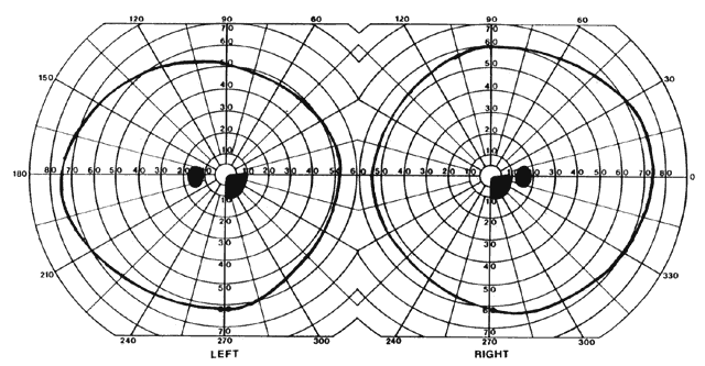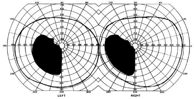 Inouye17 and Holmes and Lister18 found that in area 17 the foveal representation of the retina is located near the occipital pole, and the peripheral visual field is represented anteriorly. These insights came from studying the pattern of visual field defects in soldiers with penetrating wounds of the occiput. Further study has revealed a well-defined and orderly retinotopic arrangement of the visual field in area V1.19 The superior bank of the calcarine fissure contains cortex corresponding to the superior retina (inferior visual field), while the inferior bank contains the representation of the superior visual field. Most anterior is the representation of the monocular temporal crescent, the region of temporal field in the contralateral eye that lies beyond the limits of the nasal field (60°) of the ipsilateral eye. As is true of most of the visual system, the peripheral field is less represented than central vision. In V1, more than one half of cortex is devoted to the central 10° of vision (“cortical magnification”). Occipital cortex contains a mixture of monocular and binocular cells arranged in ocular dominance columns; however, there is no gross separation of ocular inputs. VISUAL FIELD DEFECTS FROM STRIATE LESIONS Focal destruction of the visual cortex produces a scotoma, defined as a region of the visual field within which the patient cannot reliably report the presence of targets of specific size and luminance, tested with either kinetic targets (e.g., Goldmann perimetry20) or static targets (e.g., threshold automated perimetry [Allergan, 1987]). These defects are located in the visual field contralateral to an area V1 lesion and are homonymous, being present in similar regions of the visual fields of both eyes. Their homonymous nature reflects the decussation of the nasal retinal fibers at the optic chiasm. As opposed to visual defects caused by lesions of the optic radiations and especially by lesions of the optic tracts, the hemianopic defects from V1 lesions are highly congruent, meaning that the scotoma or defect in one eye is virtually identical to that in the other eye (Figs. 3 to 7). This reflects the anatomic convergence of the inputs of one eye with that of the other in area V1.