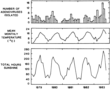 Changes in disease frequency occur for many contagious diseases that have ocular manifestations. Many childhood viral infections are characterized by an incidence rate that increases with increased exposure. The incidence then gradually declines among older age groups because the number of susceptible people decreases. Herd immunity of a population may also partially explain the emergence of one viral strain as another wanes (Fig. 9), although route of transmission and mobility of individuals probably play major roles. Knowing the endemic disease frequency and the distribution of a condition is often a prerequisite for recognizing an emerging problem. |