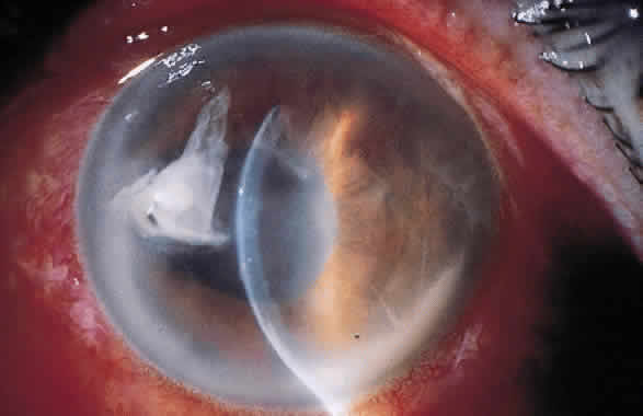 are found commonly in air, soil, dust, hay, milk, water, and wood. Bacillus species are important sources of antibiotics (e.g., bacitracin and polymyxins). VIRULENCE FACTORS AND IDENTIFICATION B. anthracis is a large organism that is arranged as single or paired bacilli in clinical specimens and as long serpentine chains and clumps in cultures. In addition to its capsular antigen, B. anthracis has a polysaccharide cell-wall somatic antigen and a toxin associated with it. This toxin consists of three antigenically distinct, heat-labile components: protective antigen, lethal factor, and edema factor. Although none of the components are active alone, the combination of protective antigen with either of the other components has toxic properties. The two major factors responsible for B. anthracis virulence are the presence of the capsule and toxin production.1,2 B. anthracis can be readily detected by the microscopic examination and culture of corneal ulcers. Large gram-positive bacilli are seen in tissue. It will grow on nonselective laboratory media with the appearance of nonhemolytic, readily growing, adherent colonies. Definitive identification requires the use of selected chemical tests and demonstration that B. anthracis is nonmotile. B. cereus also grows rapidly and is readily detected in specimens collected from infected eyes. It can resemble B. anthracis but generally is motile and produces markedly hemolytic colonies. OCULAR INFECTION Bacillus organisms are a rare but serious cause of endophthalmitis and suppurative keratitis.3,4 Several species recovered from eye infections have been identified. Failure of contact lens disinfection is an important predisposing factor to corneal infection by these organisms.5–7 In one study, 3% of contact lens-associated corneal ulcers were caused by Bacillus organisms.8 Bacillus organisms have been found in the contact lens care systems of 3% to 7% of asymptomatic patients.9,10 These organisms form spores that are resistant to heat and many types of chemical disinfectants. Once a care system is contaminated, it may be difficult to eradicate the organism. The clinical onset of B. anthracis keratitis can begin with multifocal epithelial opacities that lead to a focal stromal infiltrate. B. cereus keratitis also can be extremely severe and can rapidly progress to perforation. It may be characterized by a ring infiltrate in the stroma that is remote from the site of the injury (Fig. 1).11 A history of a corneal foreign body or other corneal trauma preceding the infection generally can be obtained (Fig. 2). B. cereus is one of the most destructive organisms affecting the inner eye that often follows trauma. The source of the organisms can be either soil contamination of the object penetrating the eye or direct inoculation of organisms colonizing the eye surface. B. cereus panophthalmitis almost always ends in complete loss of light perception within 48 hours of the injury with massive vitreoretinal destruction. The pathogenesis of B. cereus panophthalmitis is incompletely defined. At least three toxins have been implicated: necrotic toxin (a heat-labile enterotoxin), cereolysin (a potent hemolysin named after the species), and phospholipase C (a potent lecithinase). It is likely that the rapid destruction of the eye, which is characteristic of B. cereus infection, is the result of interactions of these toxins and unidentified factors.