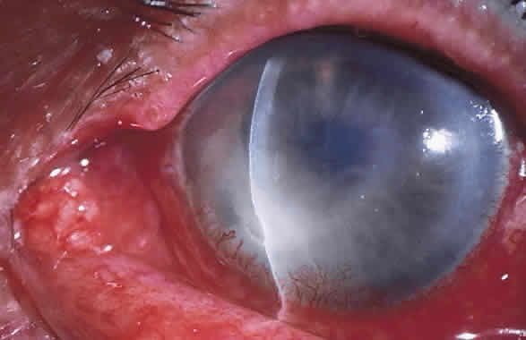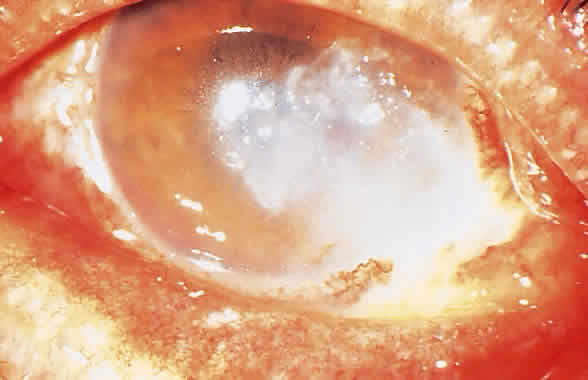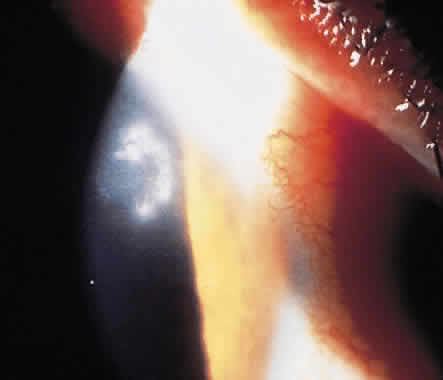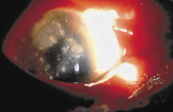 OCULAR INFECTION The two most common modes of nocardial infection are inhalation of organisms with suppurative or cavitary pulmonary infection, often simulating tuberculosis, and contamination of skin wounds with soil, causing a localized mycetoma. Pulmonary or generalized nocardial infections have become increasingly prevalent in immunocompromised patients. Nocardia occasionally may cause infections in other tissue such as brain, kidney, and bone. Keratitis,56–68 conjunctivitis,69 dacryoadenitis,70 uveitis,71 endophthalmitis,72,73 and contaminated scleral buckles have been reported. Nocardia species are a somewhat rare cause of primary conjunctivitis that may be either mucopurulent or granulomatous, sometimes associated with the development of subconjunctival scar tissue and an interstitial or superficial punctate keratitis. Corneal ulceration may occur from the direct extension of conjunctivitis (Fig. 6). Nocardial keratitis usually is preceded by minor trauma. Corneal infection occurs more frequently in young adult males and in rural areas. Such preponderances are likely related to the predisposing roles of minor corneal trauma and soil contact. Nocardial keratitis is characterized by a relatively slow and recalcitrant keratitis. Delay in identification of the causative organism sometimes causes the mistaken topical administration of corticosteroids as adjunctive therapy before a specific diagnosis. The characteristic morphology of nocardial keratitis is its resemblance to filamentous fungal ulcers. Nocardia species should be kept in mind as possible causative organisms in patients who do not respond to antifungal therapy. Minimal involvement of the epithelium with nonspecific punctate epitheliopathy often is encountered. The infiltrate usually is located in the midperiphery of the cornea, adjacent to sites of minor corneal trauma or abrasion, with superficial or midstromal involvement. The typical ulcer has a gray, sloughing base with overhanging necrotic edges (Fig. 7). The stromal involvement tends to be grossly granular or nodular in appearance. A “brush-fire” border of the infiltrates can be observed (Fig. 8). Multiple foci of infection or satellite lesions can sometimes be encountered.