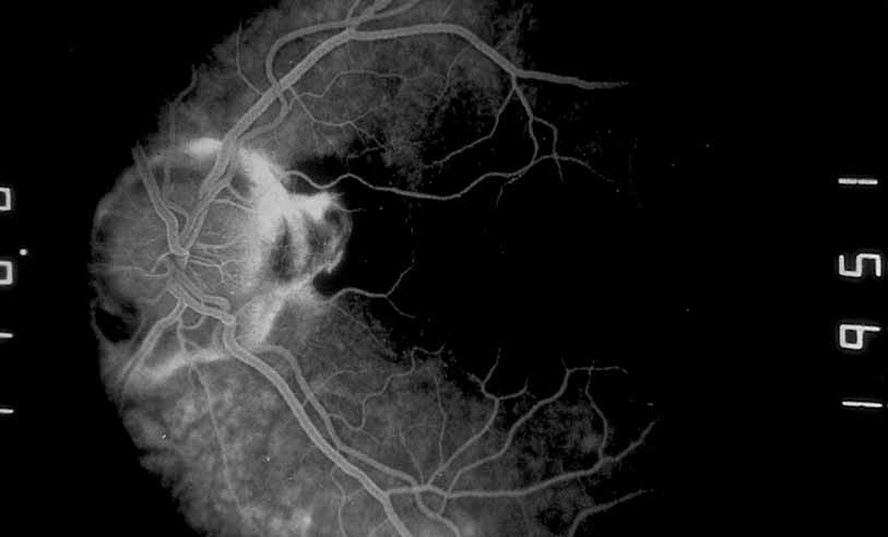 Fig. 20 Acute retinal necrosis. Fluorescein angiography shows vasculitis and patchy staining of necrotic retina.