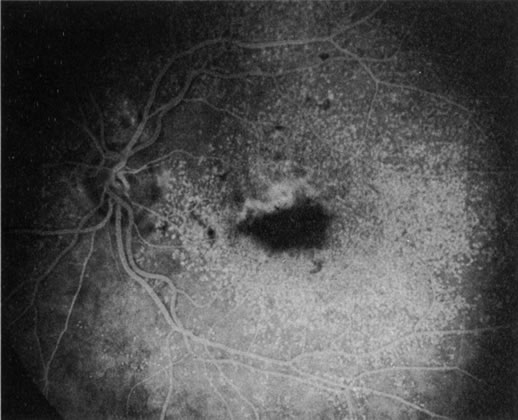PCV is characterized by the presence of dilated, choroidal vascular channels ending in orange bulging polyp-like dilations in the peripapillary and macular area. Associated features are recurrent subretinal hemorrhage and vitreous hemorrhage, relatively minimal fibrous scarring, absence of retinal vascular disease, pathologic myopia, and signs of intraocular inflammation. FA demonstrates the presence of the dilated vascular channel (Fig. 14 and 15). However, the presence of blood and exudation may block the details of the choroidal circulation on the angiogram. In these cases, ICG angiography can better demonstrate the presence of a distinct network of vessels within the choroid because the larger choroidal vessels are filled with dye.
