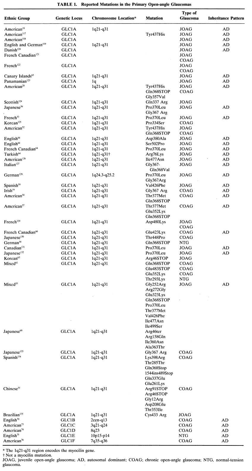 uncovered. The glaucomas can be roughly segregated into two major classes, open-angle and closed-angle, with multiple subdivisions for each type. One such subdivision is based on our understanding of the cause of the condition. Primary glaucomas refer to diseases in which we are clinically unable to determine the cause of disease, while secondary glaucomas are those caused by a specific insult, such as inflammation, trauma, or other coexisting eye condition. Of all the forms of glaucoma, the primary open-angle glaucomas are by far the most common among whites and blacks, and primary angle-closure glaucoma is more frequent among the Chinese.18 The primary open-angle glaucomas can be further subdivided into two rough groups based on the age at which the disease is manifest. Juvenile open-angle glaucoma has an onset before age 35 and adult open-angle glaucoma (usually called chronic open-angle glaucoma or even simply primary open-angle glaucoma) has an onset after age 35. JUVENILE PRIMARY OPEN-ANGLE GLAUCOMA Juvenile open-angle glaucoma (JOAG), although uncommon, has been the most extensively investigated glaucoma. It is a disease that typically affects people between the ages of 3 and 35 in an autosomal dominant fashion and is characterized by elevated IOP with accompanying optic nerve and visual field damage. In 1993 Sheffield and coworkers described an American family with JOAG who appeared to contain an abnormality in the region of the long arm of chromosome 1.19 This locus was given the name GLC1A and several groups subsequently reported pedigrees of JOAG with abnormalities at the GLC1A locus in a variety of ethnic groups (Table 1). In 1997 Stone and coworkers identified the gene associated with the GLC1A locus as the region that codes for the protein myocilin (previously known as the trabecular meshwork-induced glucocorticoid response protein, or TIGR).20 Since then, multiple investigators have reported specific mutations in the myocilin gene and its protein product in families collected from around the world (Table 1). ![]()