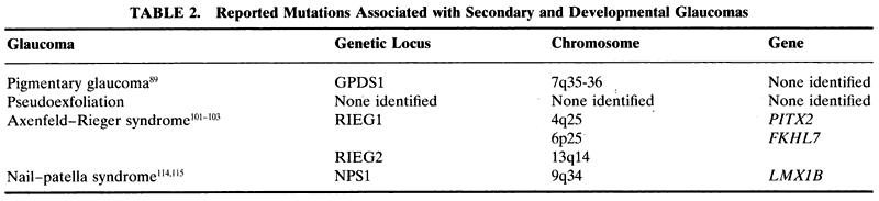 Cytochrome P4501B1 is part of a superfamily of cytochrome P450 proteins. These proteins are involved in metabolism in the cell usually by inserting oxygen into a molecule and seem to assist in keeping the cornea clear.98 In patients with the mutation at the GLC3A locus, loss of this function may be responsible for the corneal edema that is seen in congenital glaucoma. A second locus for congenital glaucoma was recently identified. Termed GLC3B, it has been localized to chromosome 1p.99 To date, there has been no gene identified with this locus. CHRONIC ANGLE-CLOSURE GLAUCOMA Angle-closure glaucoma is a term that describes a group of glaucomas associated with functional obstruction of the trabecular meshwork. Such an obstruction can be from iris peripheral anterior synechiae or from any other scar tissue or cellular layer that covers the trabecular meshwork to impede outflow of aqueous from the eye, such as in iridocorneal endothelial syndrome. Primary angle-closure glaucoma, in which peripheral anterior synechiae acutely or gradually zipper the angle shut, is thought to be the result of pupillary block that pushes the peripheral iris into the angle and results in scarring. Although there is no clear understanding why this disease occurs, it is found most commonly in the Chinese18 and can be halted by a peripheral iridectomy. The secondary angle-closure glaucomas are a diverse group of conditions in which there is a known cause of angle closure. Conditions such as neovascular glaucoma, malignant glaucoma, and iridocorneal endothelial syndrome represent some of the many diseases that can cause a secondary angle-closure glaucoma. There have been no reports to date describing any loci for primary angle-closure glaucoma. A single report has placed the gene for dominantly inherited nanophthalmos (NNO1) and angle-closure glaucoma on chromosome 11p.100 No other secondary angle-closure glaucoma has been described to have a genetic basis. OTHER DEVELOPMENTAL GLAUCOMAS The term anterior segment dysgenesis describes a variety of ocular conditions in which the anterior segment is malformed at birth. Such conditions are typically bilateral and often associated with glaucoma. Of the various syndromes and anomalies that make up this group of ocular diseases, some have been determined to have a genetic basis (Table 2). Axenfeld-Rieger syndrome describes a spectrum of anterior segment and systemic findings that are inherited in an autosomal dominant fashion with high penetrance. The condition is associated with an onset of glaucoma in childhood or early adulthood in approximately half of patients. Three genetic loci have been identified on chromosomes 4q25,101 6p25,102 and 13q14.103 The DNA at the 4q25 and 6p25 loci has been found to encode the genes PITX2 (paired-like homeodomain transcription factor 2)104 and FKHL7 (forkhead Drosophila homologue-like transcription factor gene).102 No gene has been identified to date at loci 13q14. The PITX2 gene is a paired homeobox gene that regulates the expression of other genes during development. Mutations in this gene have also been associated with autosomal dominant iris hypoplasia,105,106 iridogoniodysgenesis syndrome,107 and a single case of Peter anomaly.108 FKHL7 is also a gene that regulates the expression of other genes during development. In the mouse, the homologue gene FOXC1, is expressed in mesenchyme from which the drainage structures of the anterior segment are derived. Although mice with this mutation had anterior segment anomalies, they did not have increased IOP. This suggests an interaction of some sort with another gene is responsible for the glaucoma associated with this condition.109 Mutations at the 6p25 locus have been associated with a variety of anterior segment abnormalities, such as Axenfeld anomaly, iris hypoplasia, Rieger anomaly, posterior embryotoxon,102 iridogoniodysgenesis anomaly,110 and familial glaucoma iridogoniodysplasia.111 Not all the patients with mutations in the 6p25 locus have mutations of the FKHL7 gene. Only those with features of Axenfeld-Rieger anomaly had mutations in this gene.112 The important message from the genetics of Axenfeld-Rieger syndrome is that multiple phenotypic variations can be caused by mutations in the same genes. This supports the notion that there is no useful information to be gained from splitting these conditions into separate diseases and the spectrum of phenotypic findings should be lumped under the name Axenfeld-Rieger syndrome.113 The nail-patella syndrome (NPS1) has been localized to chromosome 9q34114 and its gene LMX1B.115 This gene is a transcription factor important in skeletal development. |