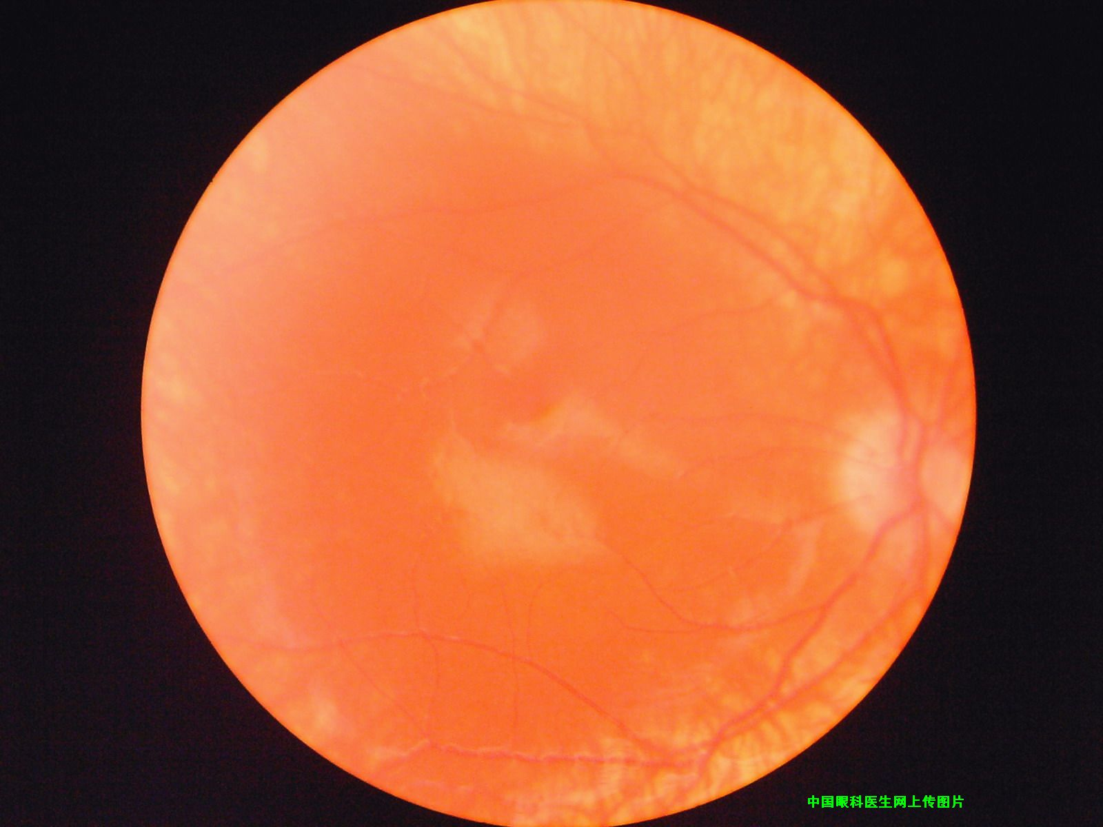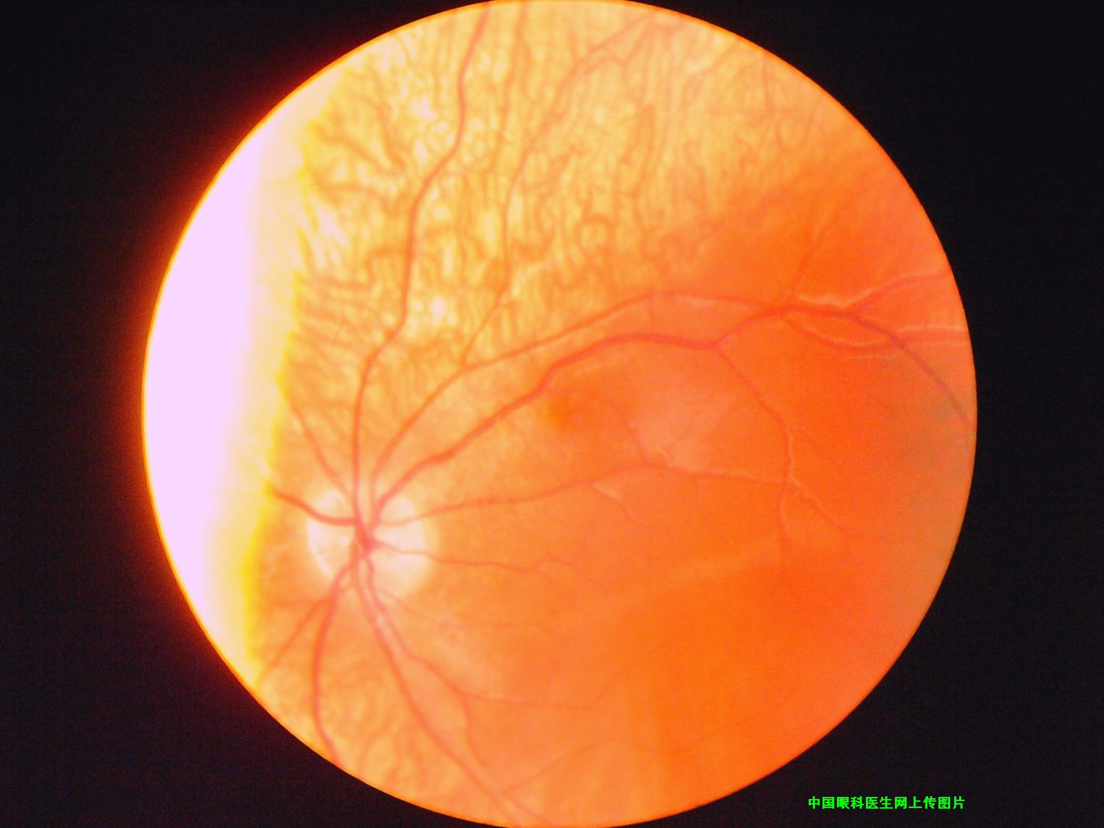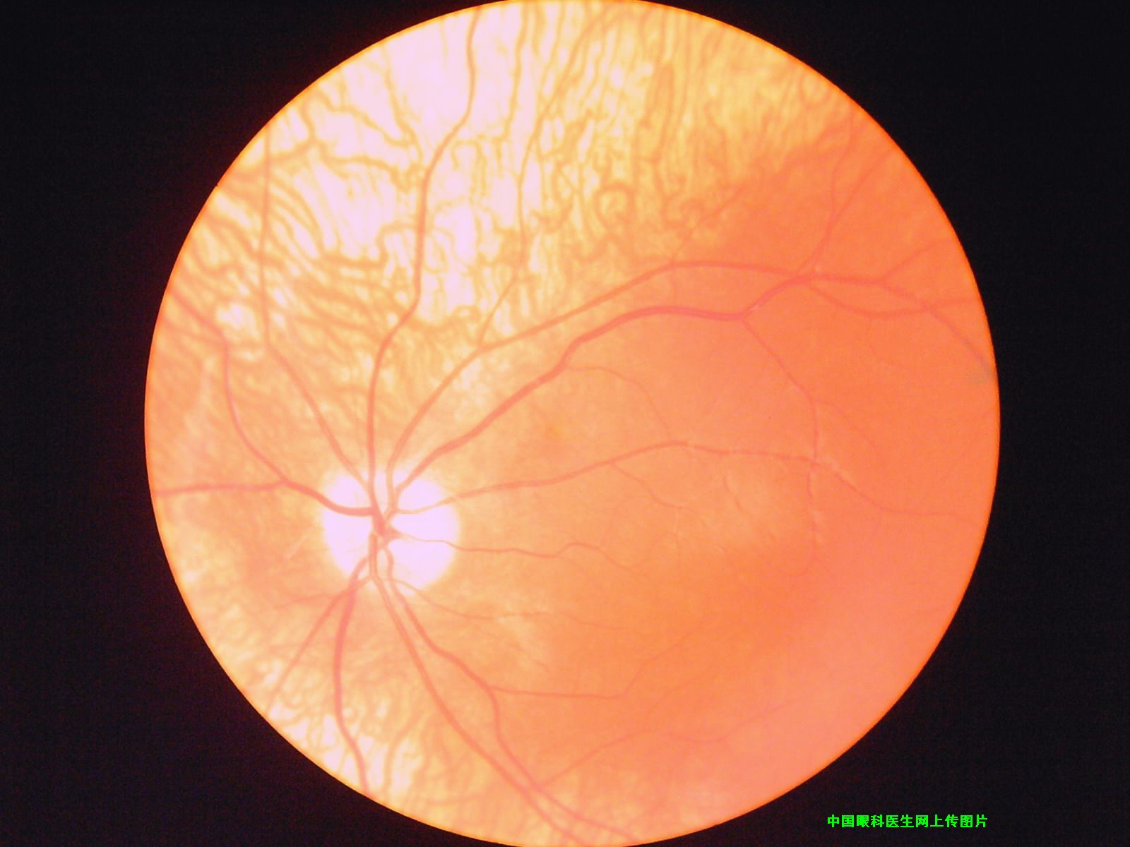 患儿,女,3岁,於2006年4月14日来我院求诊。其母诉患儿自小畏光,患儿系第一胎足月平产,否认有宫内窒息史及产后窒息史,生长发育与同龄儿相仿。母亲怀孕期间体健,父母均健康,否认近亲婚配史,否认家族中类似病史。体查:患儿营养中等,发育正常,全身皮肤、毛发色泽正常,四肢、指趾未见异常,心、肺(—)。眼部检查:双眼球呈粗而缓慢的钟摆性水平型眼球震颤,无快慢相之分,双眼屈光间质清,虹膜棕色,纹理清晰,双瞳孔等大等圆约3.5mm,光反射(+)。予以美多丽滴眼液扩瞳后行眼底检查:患儿双眼底呈橙红色,视盘大小正常,色淡粉,边界稍模糊,视网膜色素缺如,视网膜血管及呈网状分布的脉络膜血管一览无遗,双黄斑发育不良,中心凹反光未见(如照片示)。因患儿查体欠合作,视力、验光、视觉电生理等检查未能完成。
