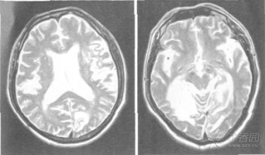 头颅CT示左侧大脑半球低密度影,右侧颞顶枕叶软化灶。诊断考虑定位于左侧大脑半球大脑中动脉与后动脉供血区,定性为缺血性脑血管病,首先考虑脑血栓形成。入院后血尿便常规、红细胞沉降率、血凝、血脂、血糖、电解质和肝肾功能等均正常。心电图示异常Q波。心脏超声示左室松弛性下降,颈动脉超声示双侧颈总动脉内膜毛糙。TCD示左侧大脑中动脉-颈内动脉分叉部伴杂音,脑动脉血流速度减低,弹性下降。头颅MRI示左侧基底节区和左侧颞枕叶急性脑梗死,右侧颞顶枕叶陈旧性脑梗死(图1)。视觉诱发电位结果正常。请眼科医师会诊,考虑患者色觉障碍为脑梗死引起,属后天性,查后天色觉障碍检查表(第V组)2004版:图99读为90,图60未能读,图266读为200,图928读为911,图68读为62,准确率为30%。